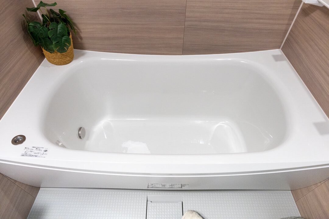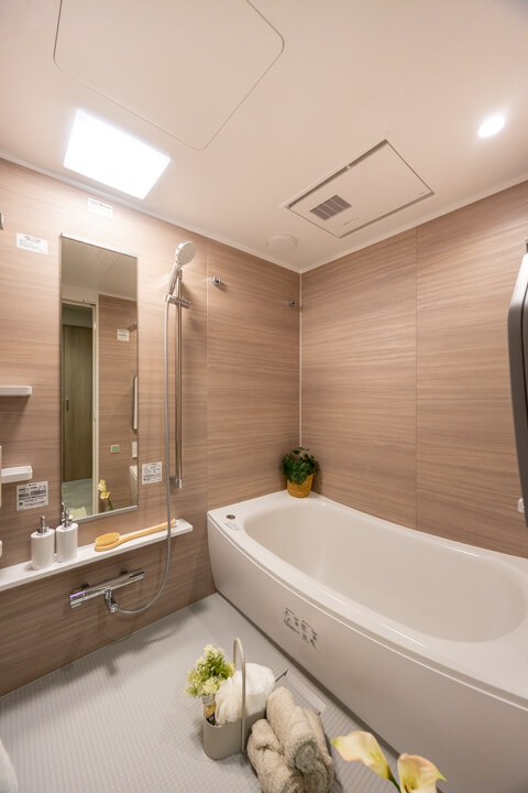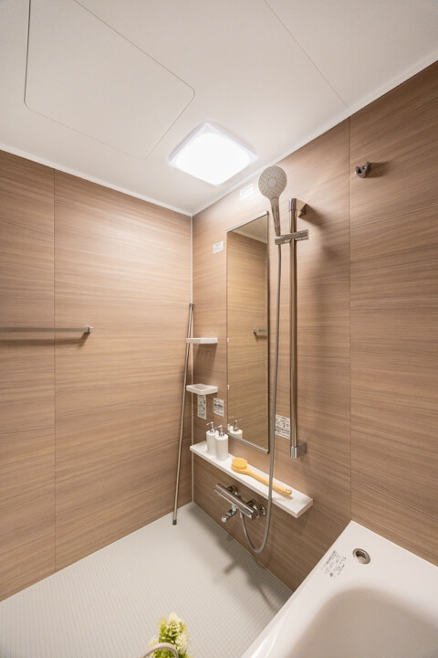 ブラウンの壁パネルが落ち着いた雰囲気を演出してくれている浴室です。お風呂にゆっくり浸かるのが好きという方に嬉しい追い焚き機能を搭載。家族の入浴時間がずれてしまっても安心です。また、浴室乾燥機には暖房・乾燥・換気・涼風の機能がついており、一年中快適に過ごすことができます。