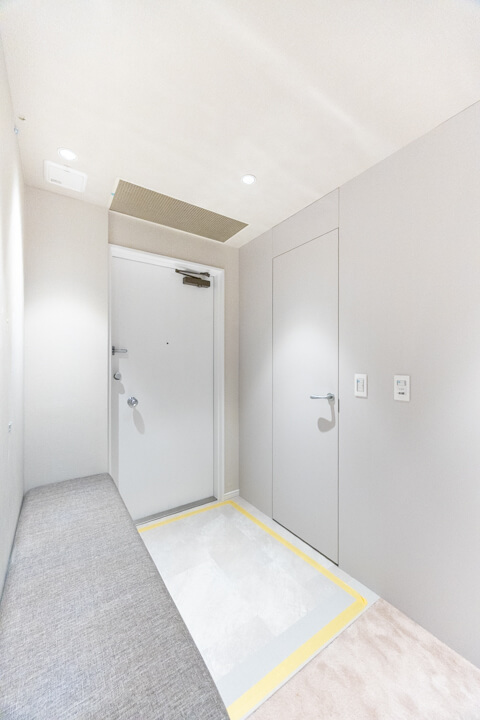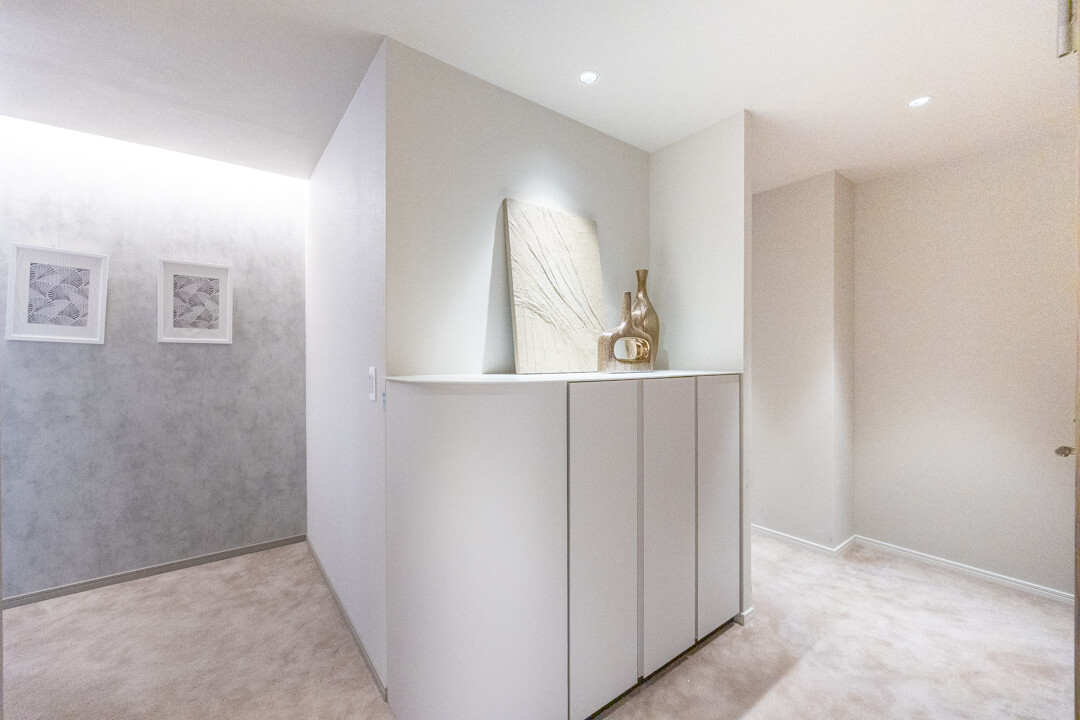 スタイリッシュな雰囲気の玄関にはシューズインクローゼットが造られています。たくさんの靴やアウトドアグッズなどを収納できて便利。また、ベンチも設置されているので、座りながら靴を着脱することができますよ。廊下にはピクチャーレールやカウンターが造られており、自分好みの空間に演出することが可能です。