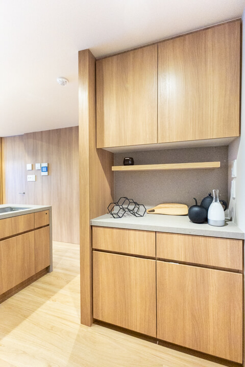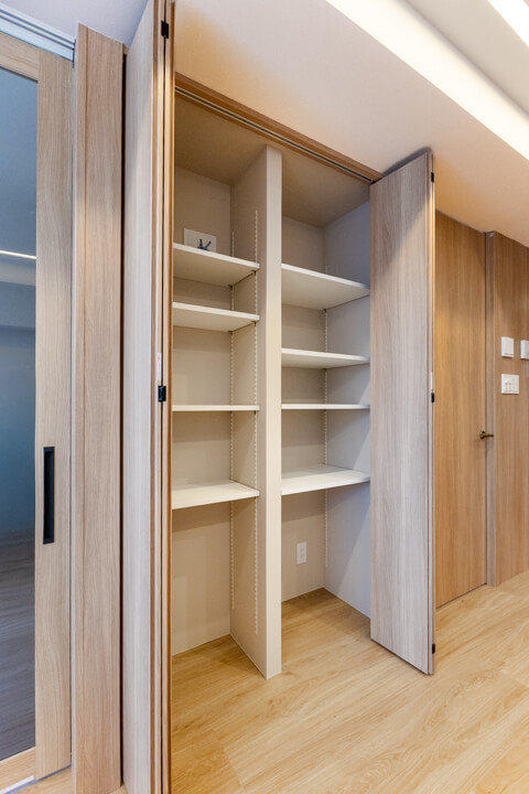 カップボード完備で収納力◎。キッチンと同じデザインで統一感があります。食料品のストックや食器類を整理整頓でき、ごちゃごちゃしがちなキッチンまわりがすっきり片付きそうですね。