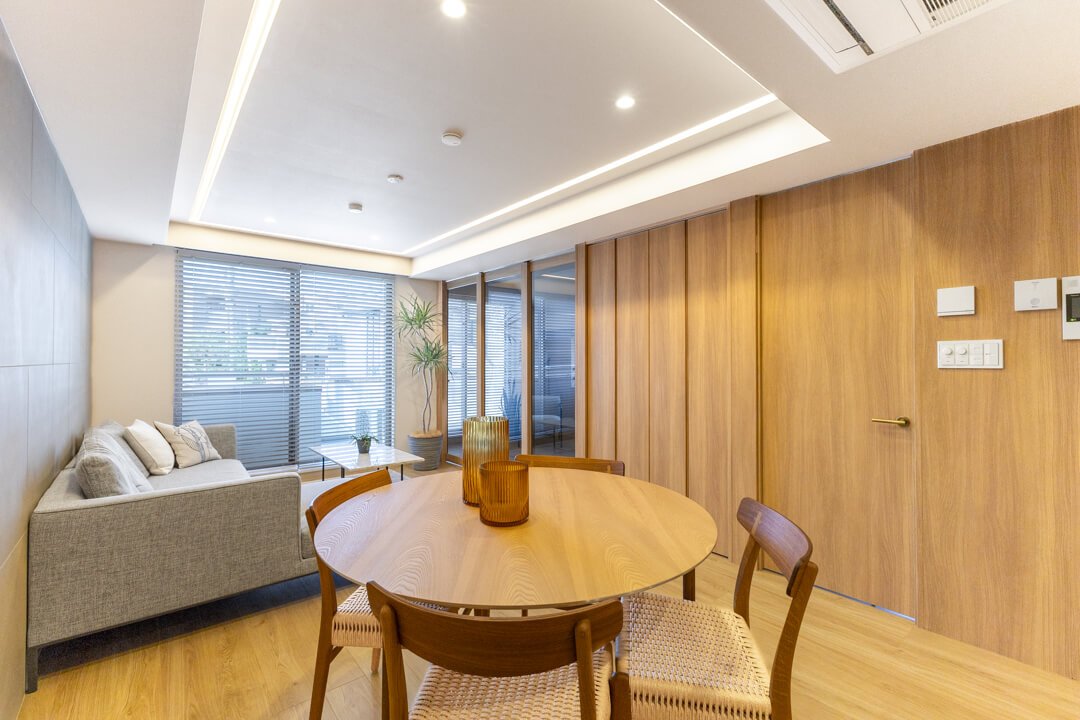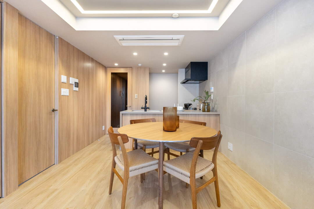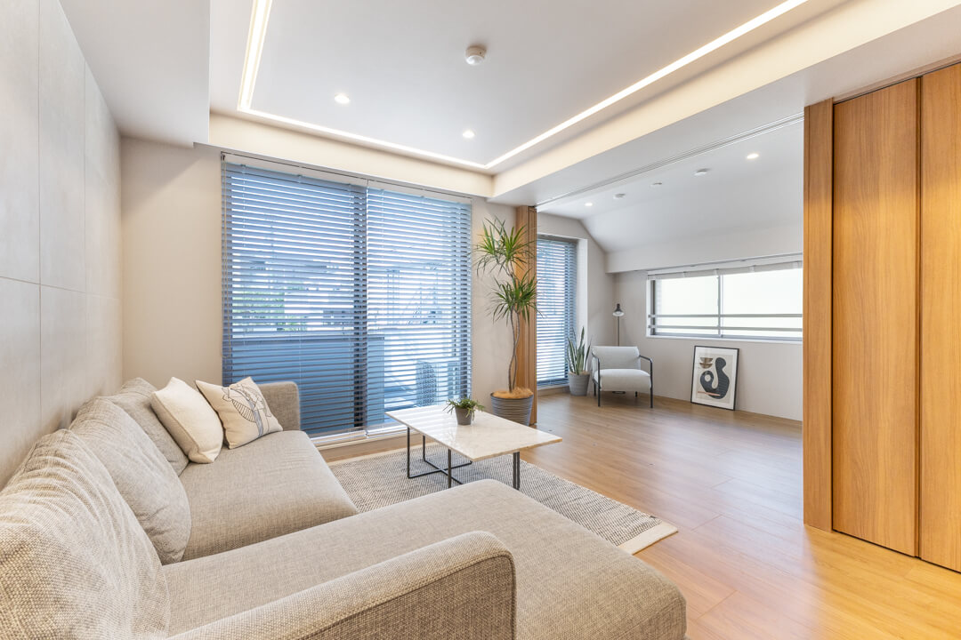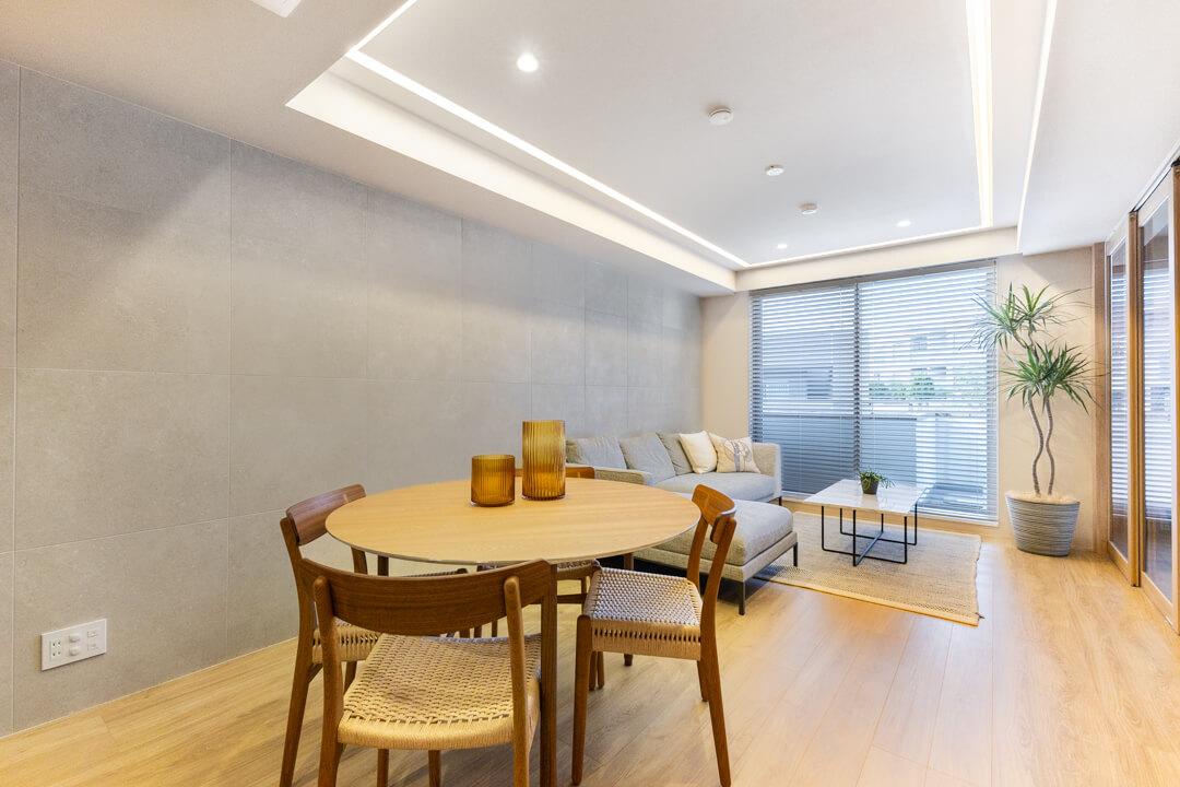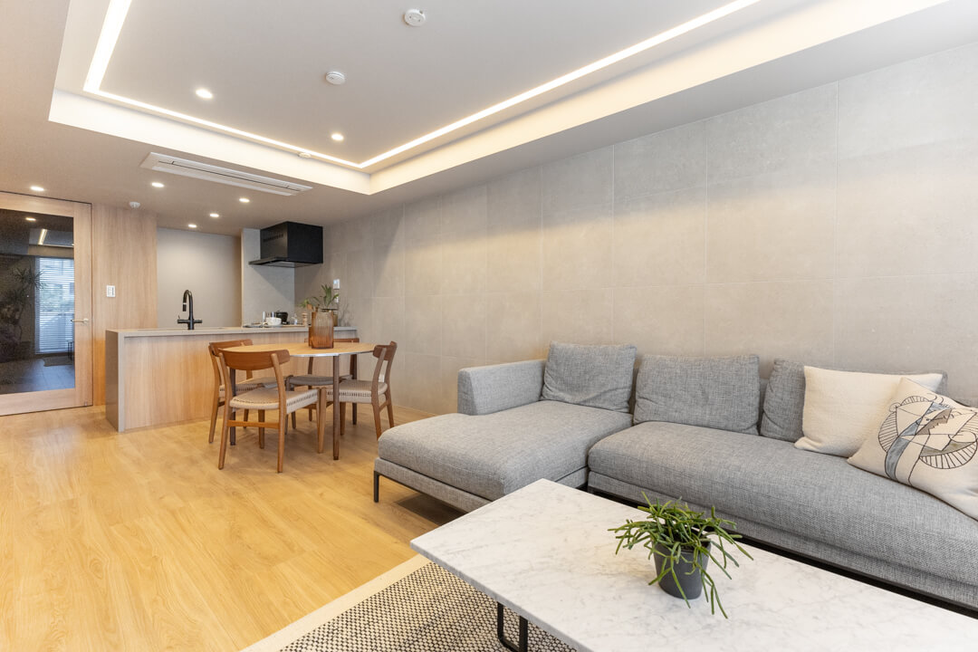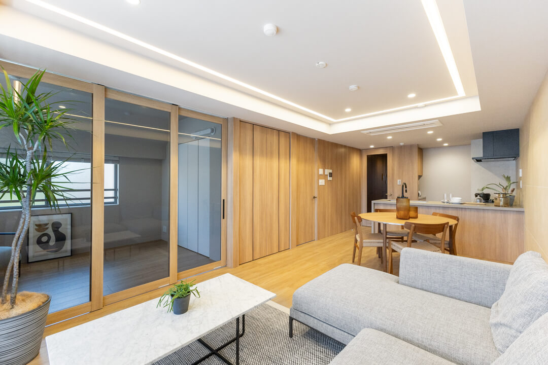 約16.5帖のLDK。バルコニー付きで開放的な空間です。ユナイテッドアローズ社監修のリノベーションで、こだわりの内装が魅力的。折り上げ天井に設置されたライン照明やタイル貼りのアクセントウォールが、上質な雰囲気を演出します。フローリングには贅沢に無垢材を使用しており、天然木の美しさとぬくもりを感じることができます。
