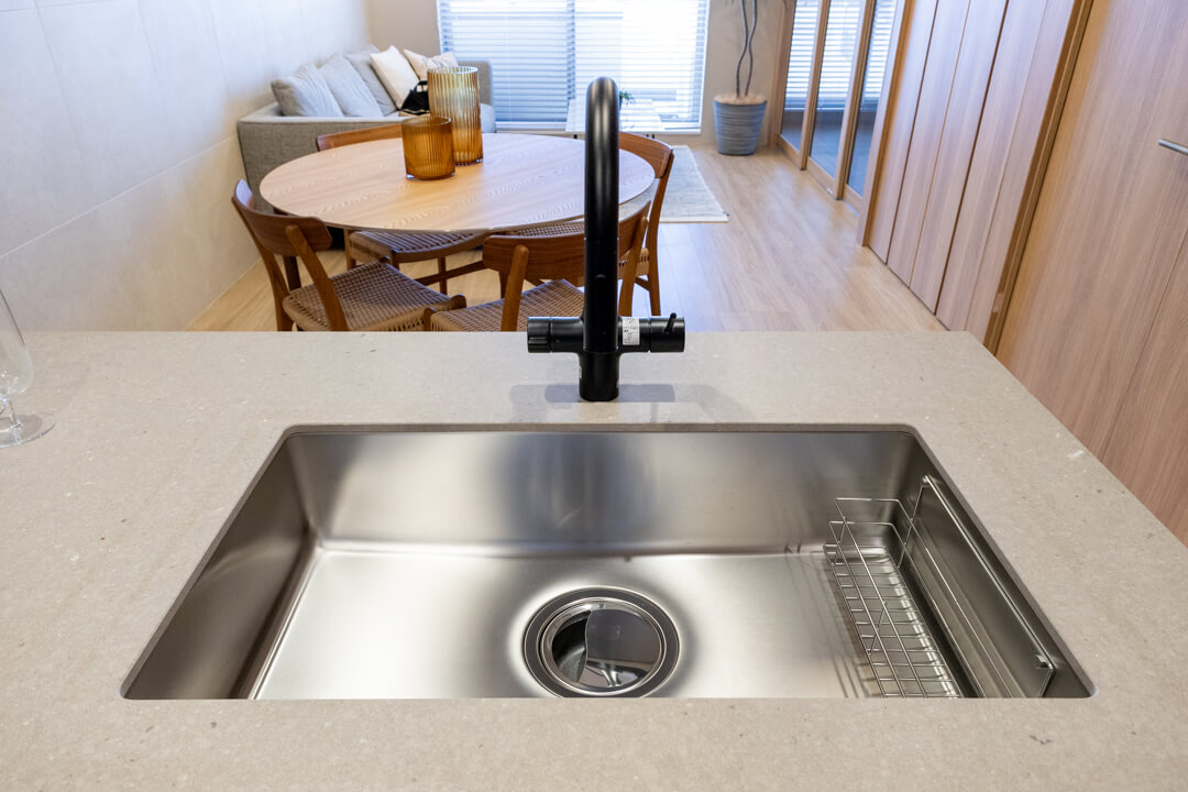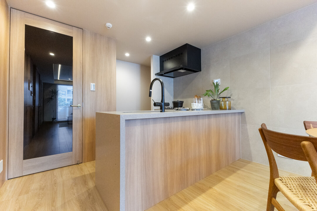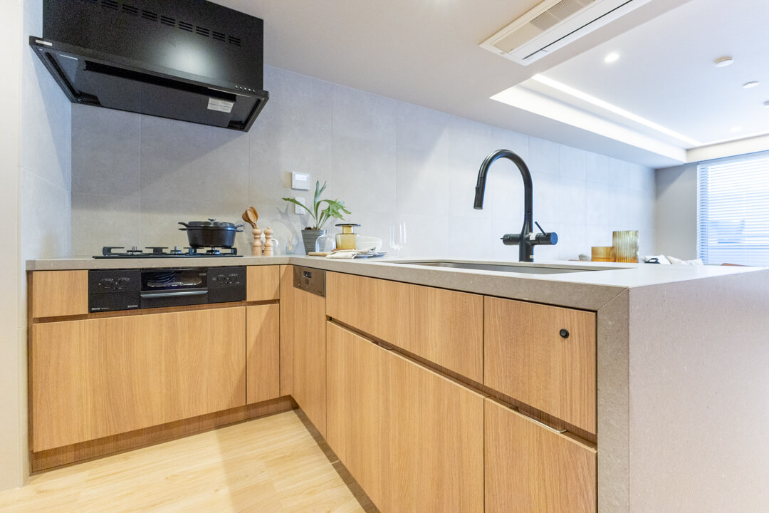 木目デザインがお部屋に馴染む、家具のようなキッチン。作業・収納スペースともに広く確保できるL型です。シンク側からはリビングダイニングを見渡すことができ、会話を楽しみながら調理ができるのも嬉しいポイントです。
