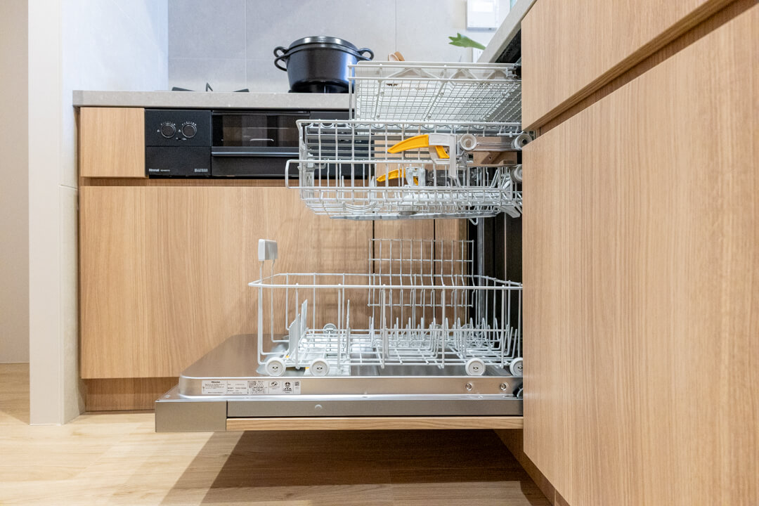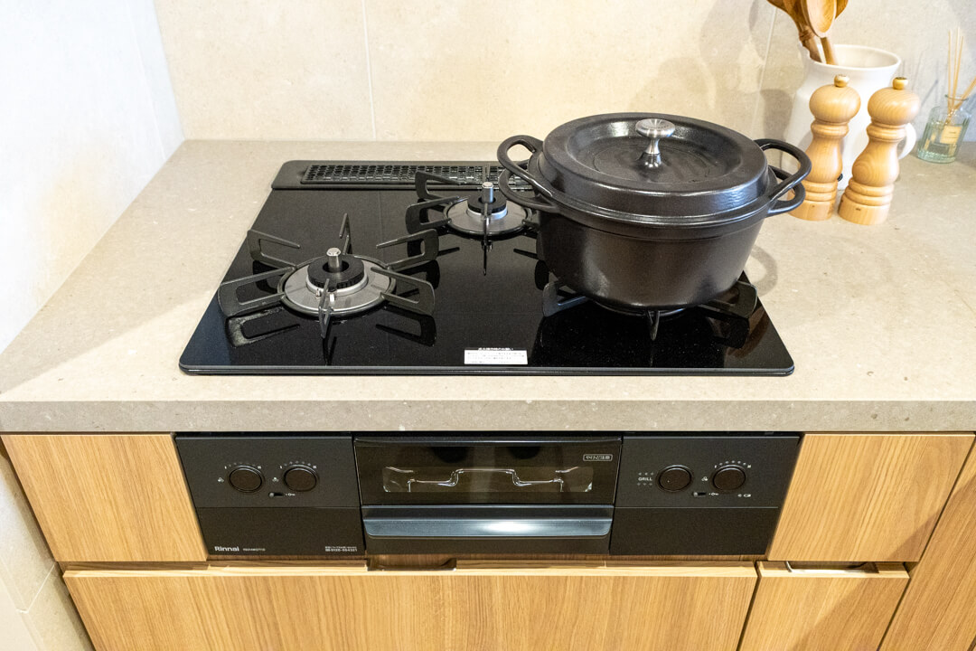 効率良く調理ができるグリル付3口ガスコンロを完備。ガラストップ仕様で美しく、お手入れのしやすさも魅力です。さらに、容量の大きさが魅力的なMiele(ミーレ)製の食洗機が内蔵されていて、後片付けも捗りそうです。