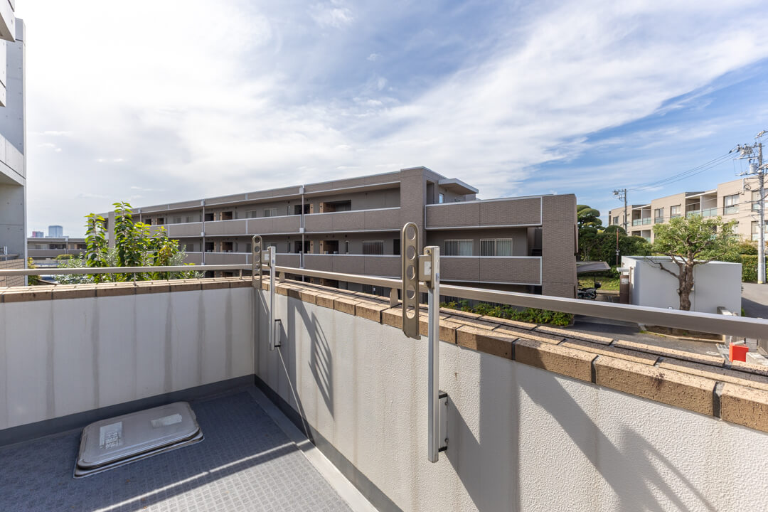LDKに接続するバルコニー。最大奥行き1800mmの広々としたスペースです。洗濯物を干すだけでなく、椅子に座って日向ぼっこをするのも◎。第一種低層住居専用地域のため、青空を見上げる落ち着いた眺めが魅力的です。