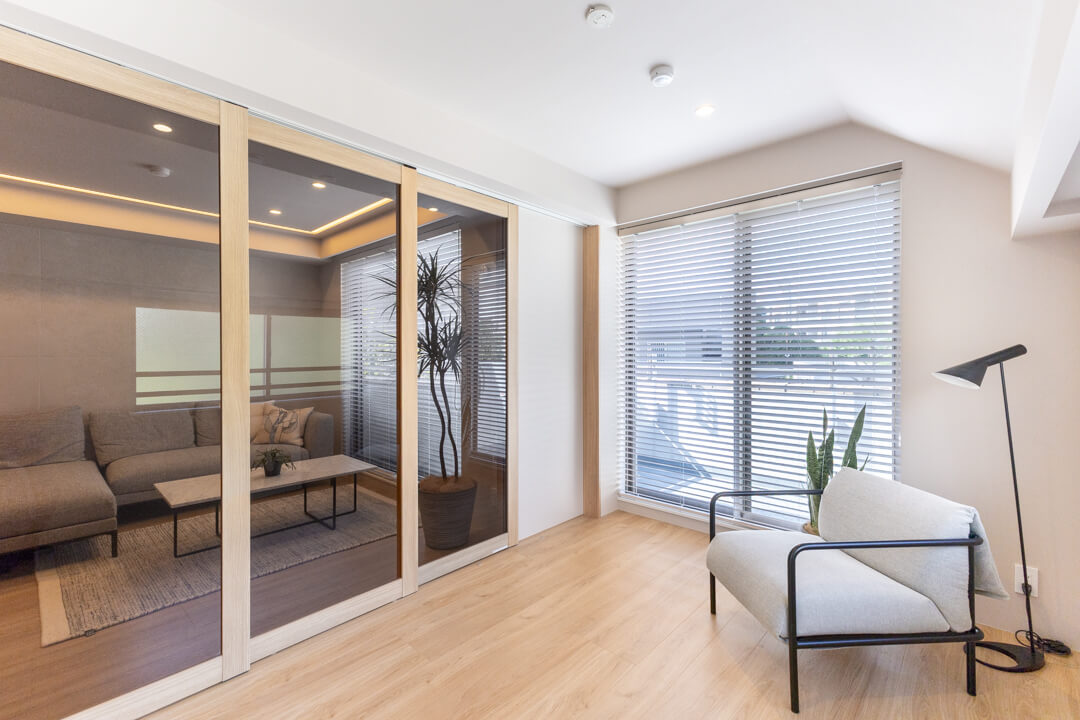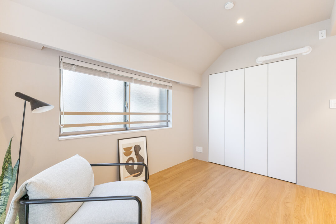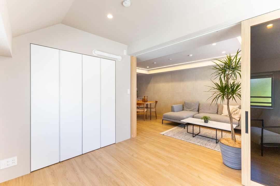 LDKに接続する洋室3。約5.7帖です。バルコニー付きの2面窓で、明るく風通し良好です。LDKとはガラス扉で仕切られていて、ほど良いこもり感のある空間。ワークスペースや趣味部屋、扉を開放して拡張リビングなど、フレキシブルに活用できます。