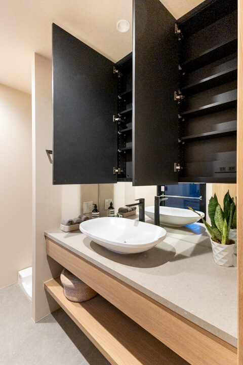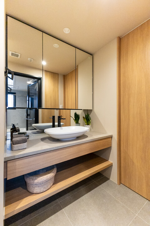 木目基調で温かみを感じる洗面化粧台。すっきりとした印象のフロートタイプです。大きな三面鏡&ミドルミラー付きで身だしなみを整えるのに便利。三面鏡裏は収納棚になっていて、洗面まわりの小物をすっきり収納できますよ。タオルやパジャマの収納に便利なリネン庫も完備しています。
