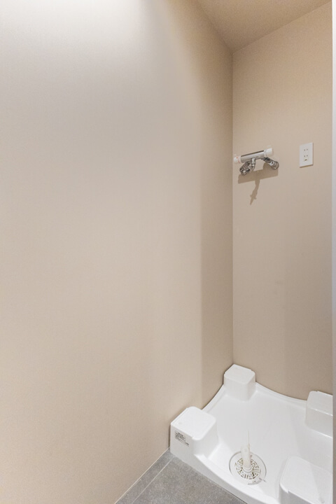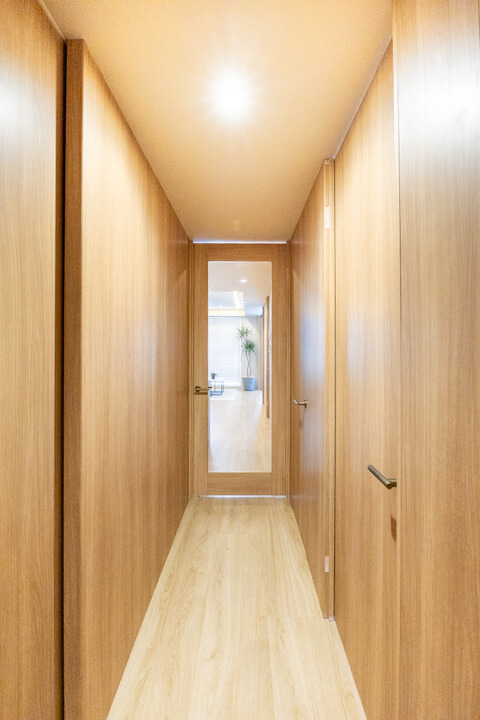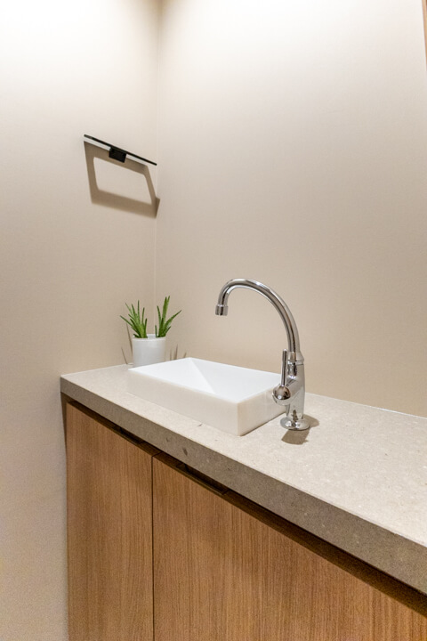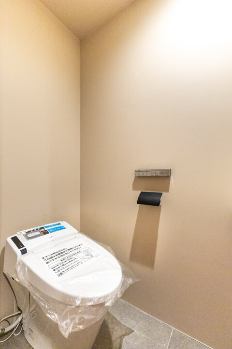 廊下に面していて独立性の高いレストルーム。LIXIL製の洗浄機能付トイレに新規交換済みです。タンクレス仕様なので、タンク掃除の負担を軽減できますよ。正面には手洗いカウンターがあり、ゲストを洗面室まで案内する手間がかからないのも嬉しいポイントです。