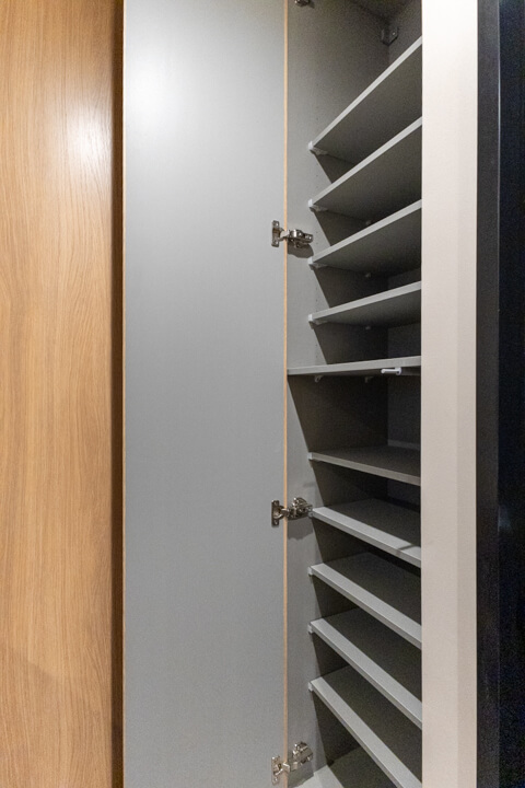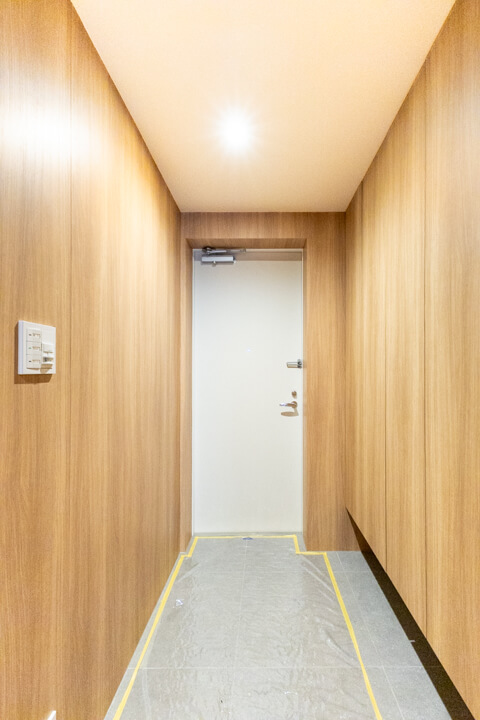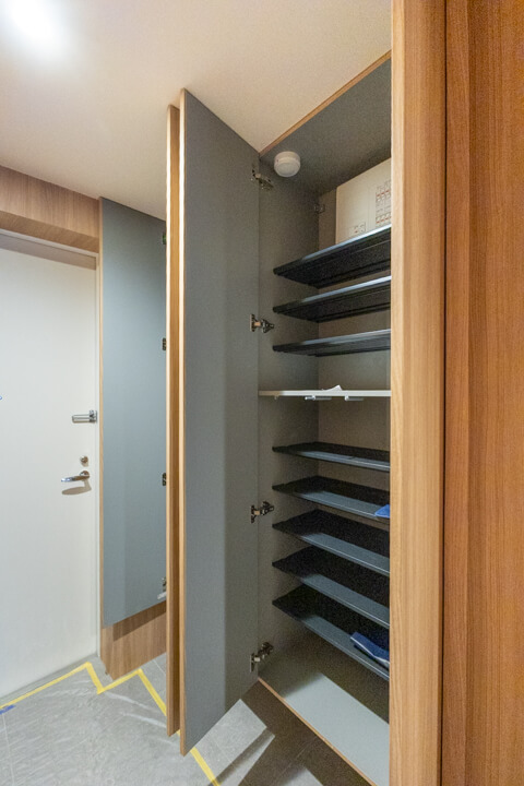 温もりを感じる木目基調の玄関ホール。壁と建具のデザインが統一されていて、スタイリッシュな印象です。人感センサー搭載の照明で、いつも明るく出迎えてくれますよ。トールタイプのシューズボックス完備で収納力も◎。散らかりがちな靴をすっきり収納できます。