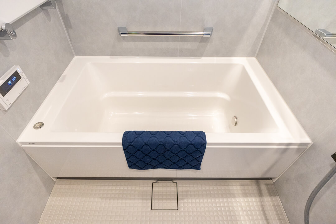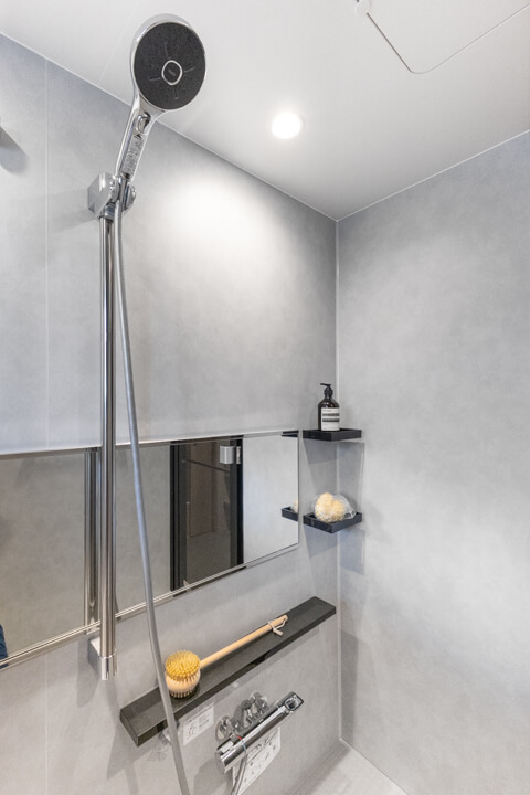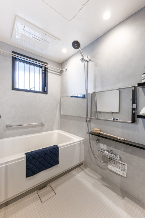 グレー基調でシックな印象のバスルーム。1418サイズです。ワイドミラーが奥行きをもたらし、広々とした印象に。窓付きで自然換気できるのも嬉しいポイントです。浴室換気乾燥暖房機・追い焚き機能搭載で1年中快適に入浴できます。
