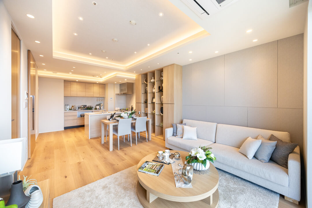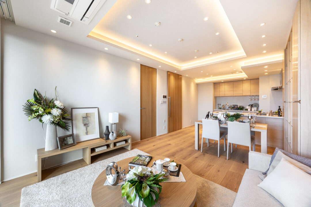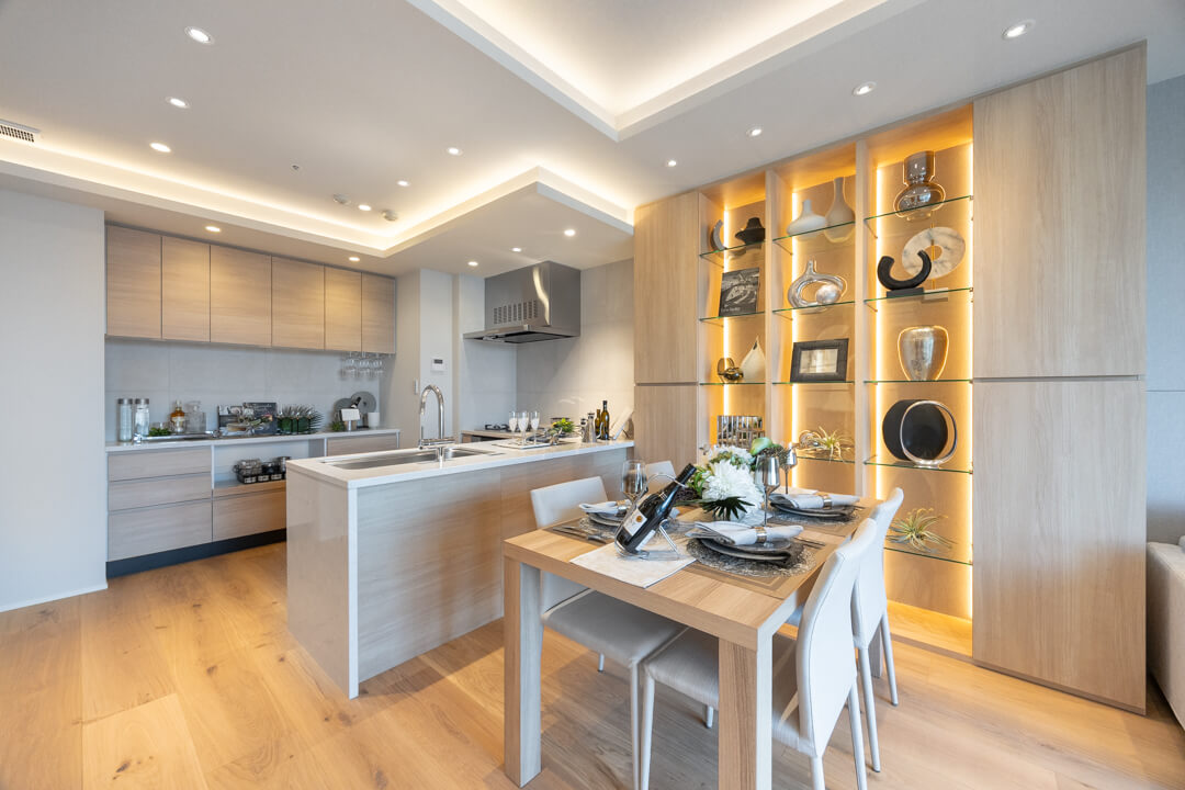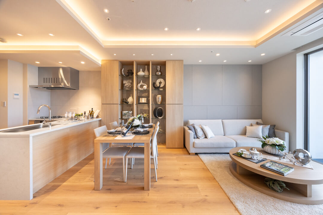 家族でゆったり過ごせるゆとりある広さのリビングダイニング。天井には間接照明が施されており、やさしい光で空間を包み込んでくれます。あたたかみのある内装デザインが心地よさを与えます。リビングの一角には存在感のある飾り棚を完備。こちらの棚にも間接照明が付いていて、空間の演出性を高めてくれます。