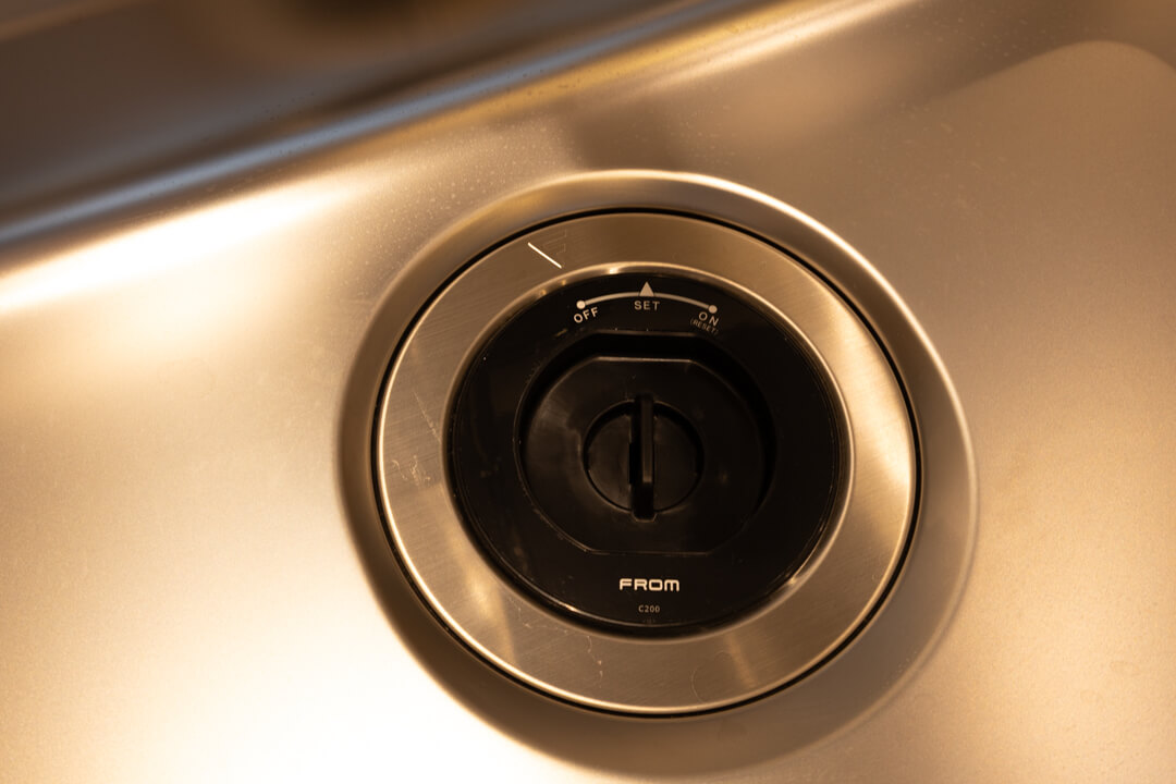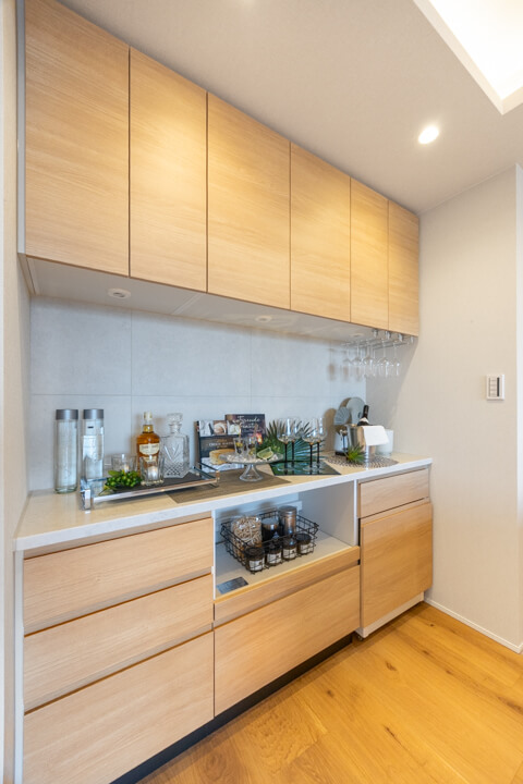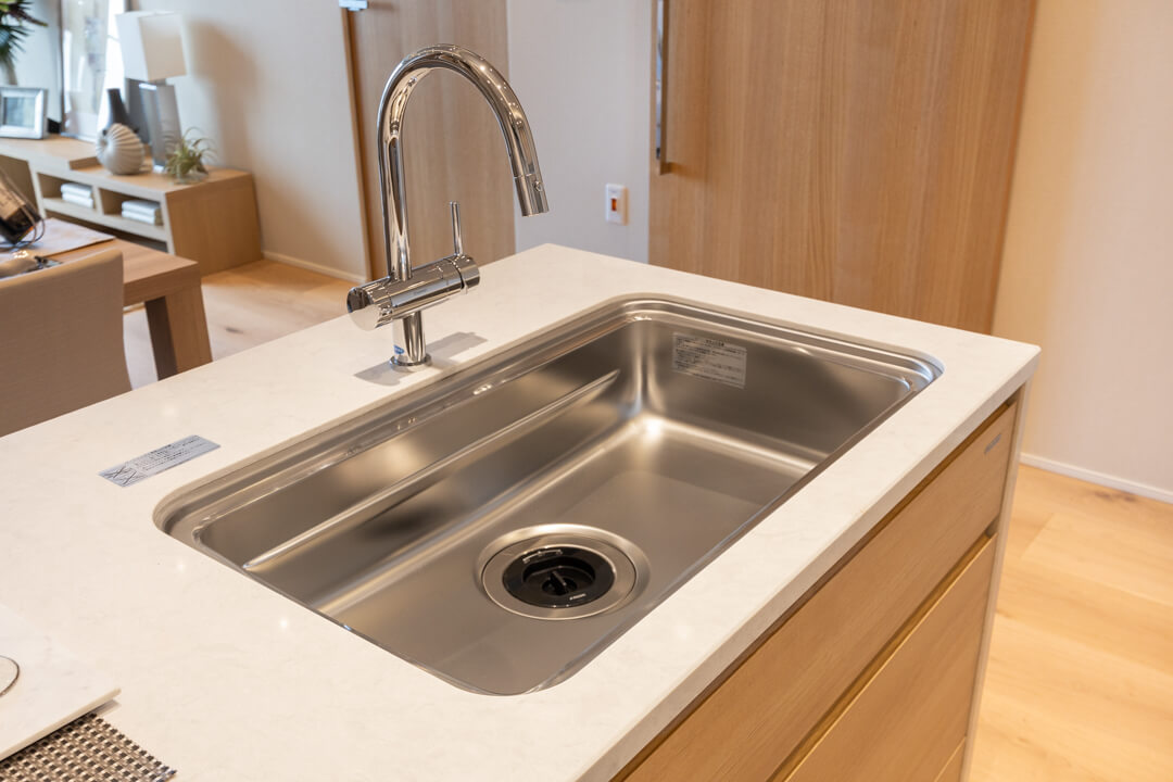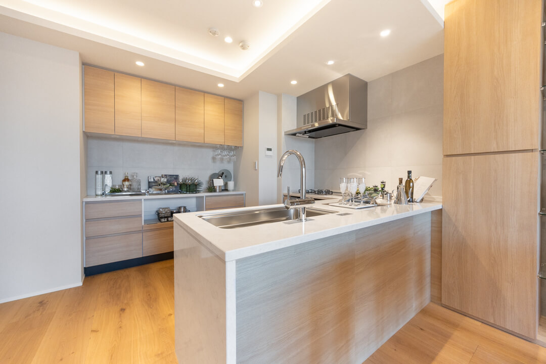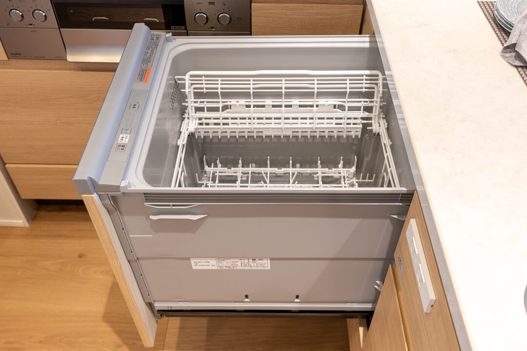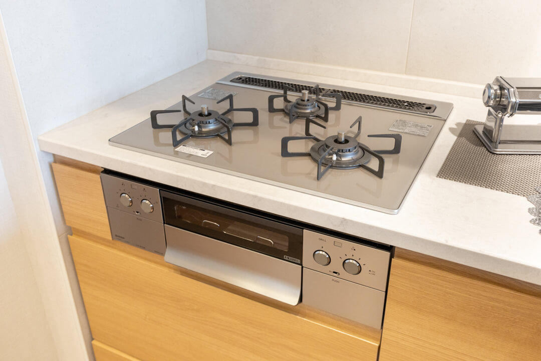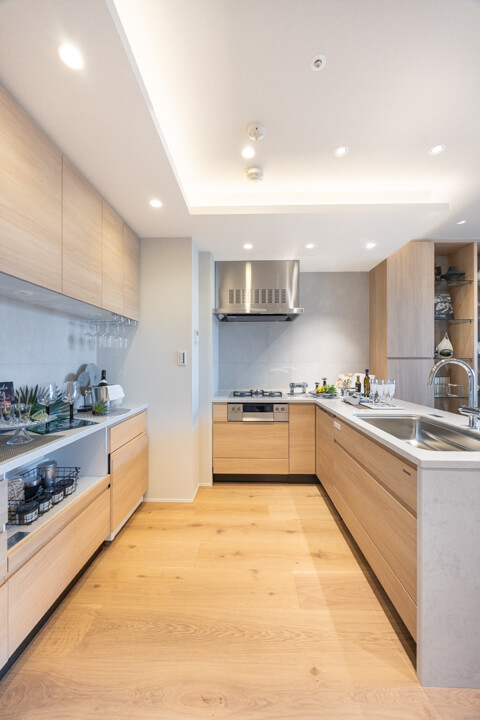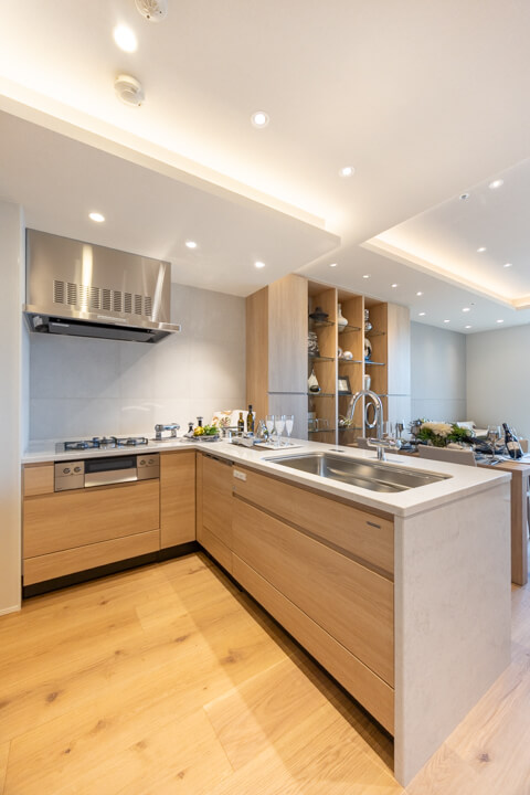 リビングダイニングを見渡せる開放的なオープンキッチン。家族やゲストと会話がしやすく、小さなお子さんがいるご家庭では子どもの姿を見守れます。作業スペース広々のL字型システムキッチンで、料理が捗る3口ガスコンロ、家事の時短に心強い食洗機、生ごみの処理に便利なディスポーザー付き。カップボードも設置されています。