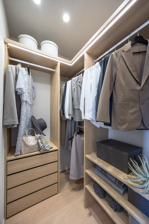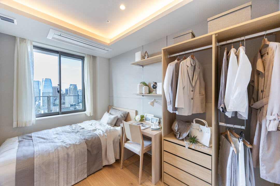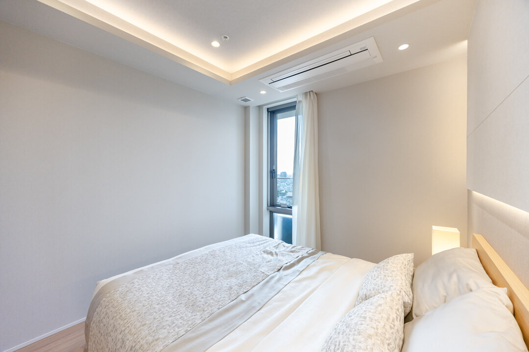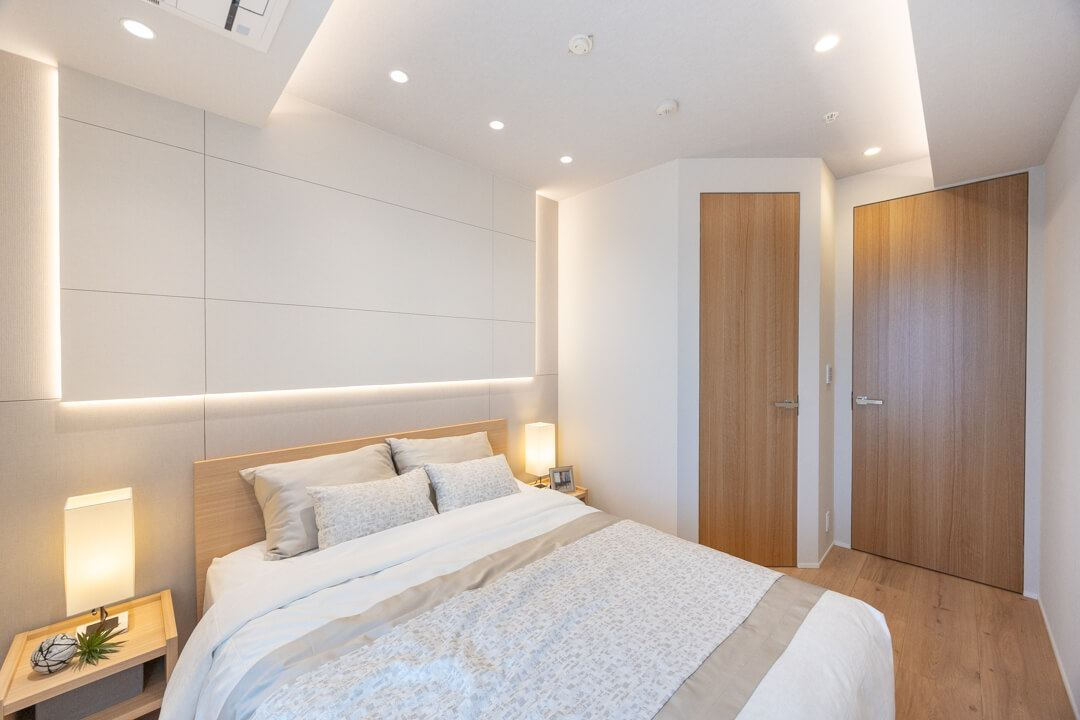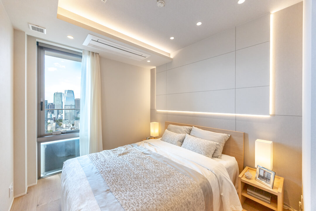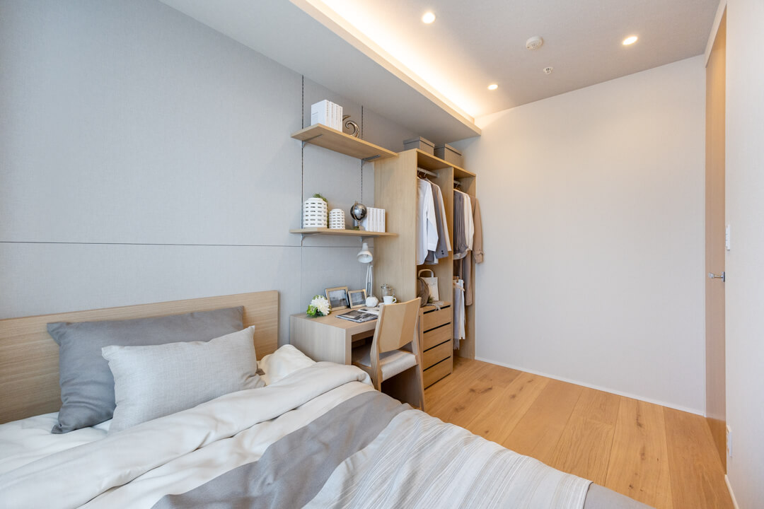 間接照明が美しい洋室。ホテルライクなベッドルームを演出できそうです。窓はバルコニーに面して眺望も良好。WIC(ウォークインクローゼット)には可動棚と引き出し収納付きで機能的です。