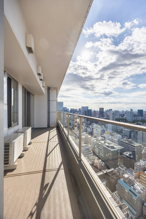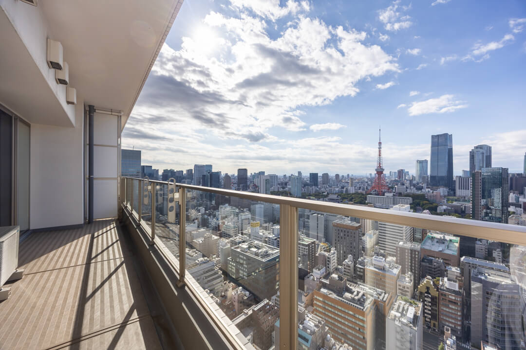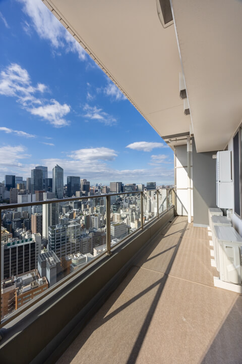 全居室に面したワイドスパンバルコニー。夕方まで明るさが続く西向きです。約17.68㎡のゆとりある広さ。手すりが透明になっていて、開放感もよりたっぷりと感じられます。34階部につき眺望良好。都心のビル群と東京タワーが望めます。夜にはまた違った景色が堪能できそうですね。