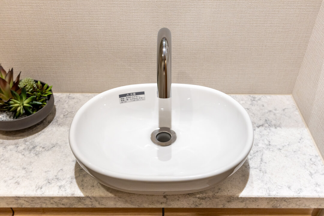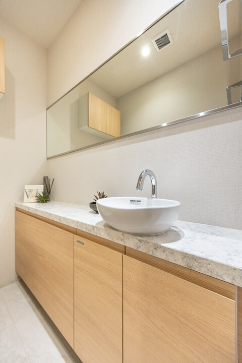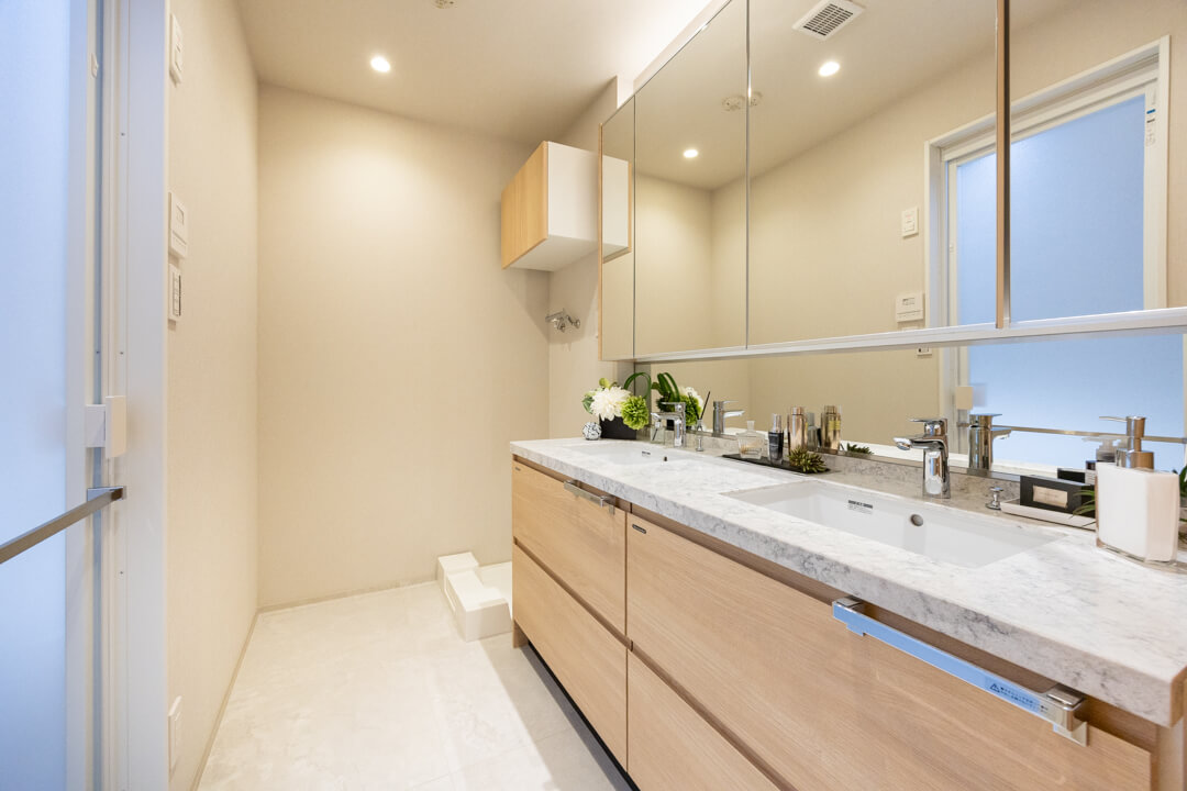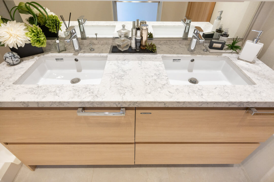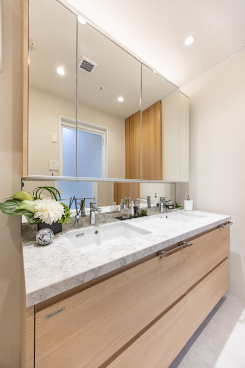 ホテルライクな2ボウルの洗面化粧台。家族で使用時間が重なってもそれぞれゆっくり使えます。洗面まわりの小物がすっきり整頓できるミラーボックスや、モノの出し入れがしやすい引き出し式のキャビネット付きで使い勝手の良さもポイントです。