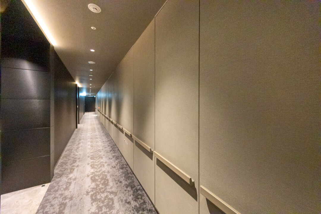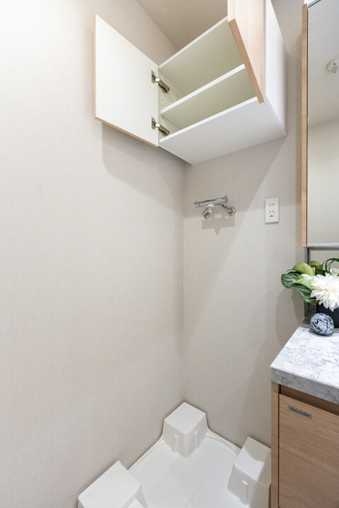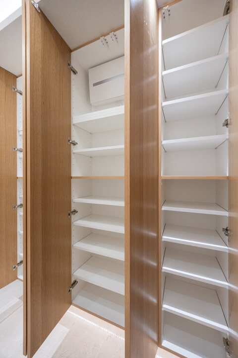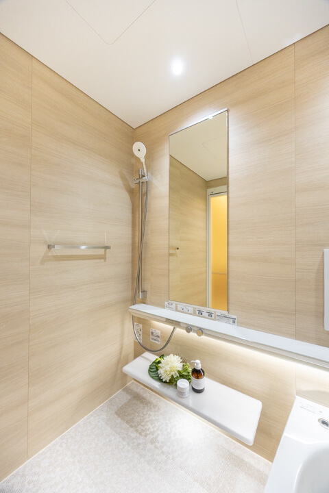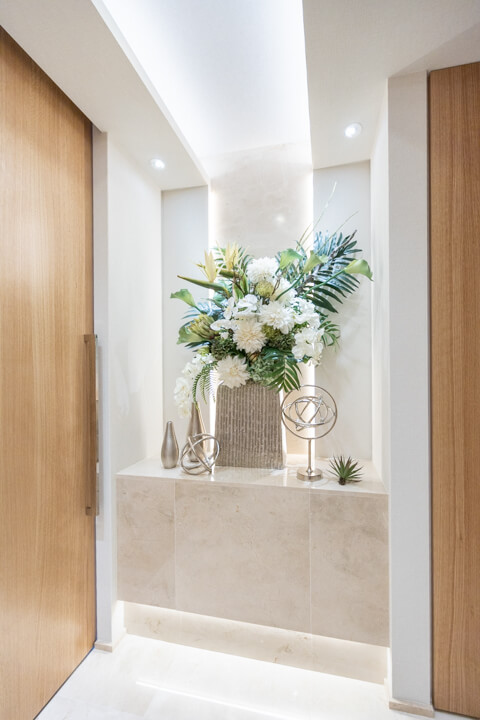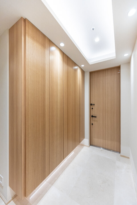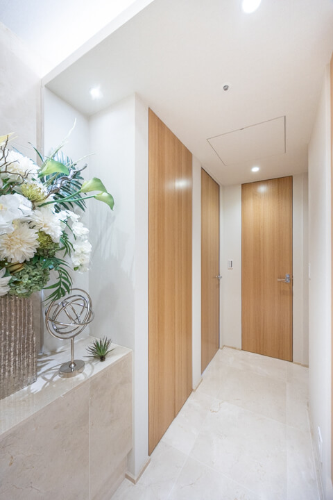 玄関には天井までの高さのあるシューズボックスを完備。足元にはフットライトが備わっていて、一年中快適にバスタイムが楽しめます。廊下にも収納スペースが備わっていて、日用品の整頓にも便利です。また、廊下の正面には間接照明付きのニッチが設置されていて、季節の花やアートを飾って空間に彩りをプラスできます。
