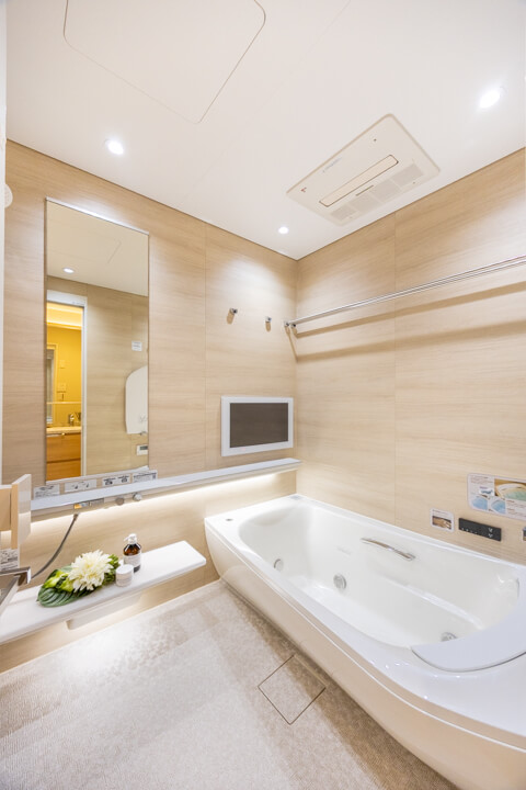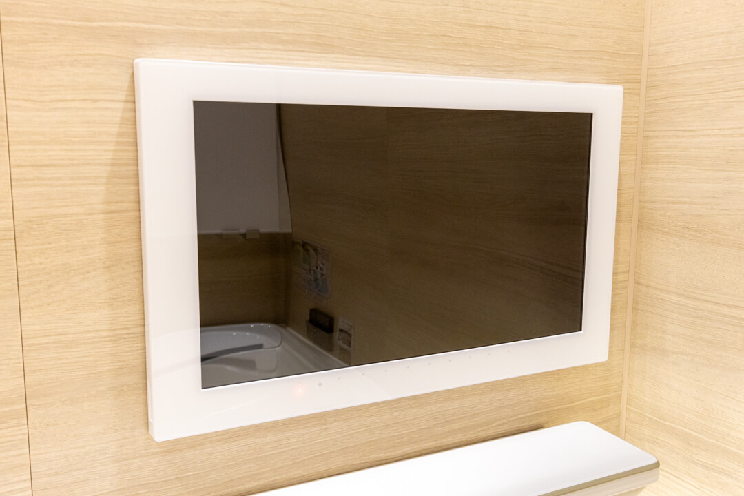 バスルーム空間で映像を楽しめる浴室テレビが設置されています。照明を落として観賞すれば、映画館のような雰囲気でバスタイムが楽しめます。
