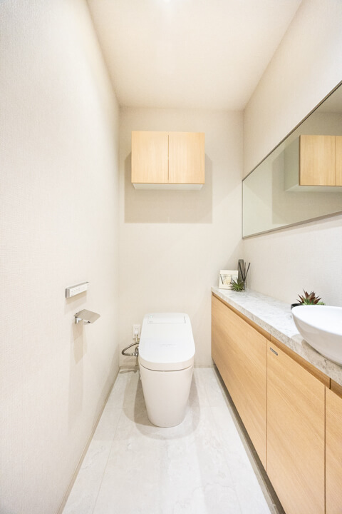 廊下に面したレストルーム。空間がすっきり見えるタンクレストイレです。独立型の手洗いカウンター、ウォシュレット、収納スペース付きで雨の日や冬場の洗濯にも困りません。