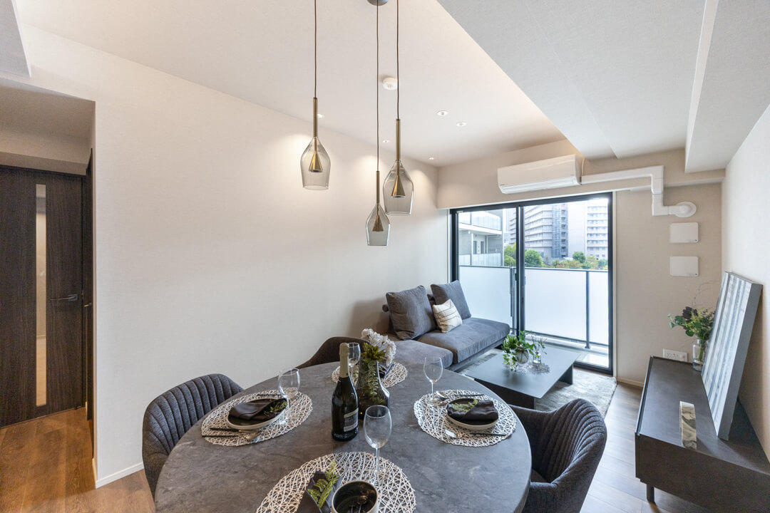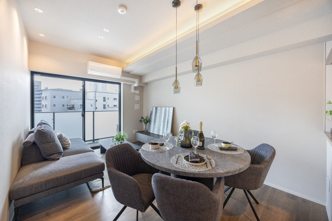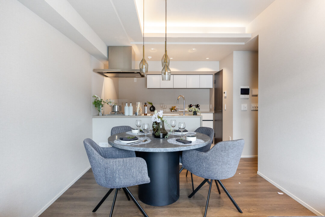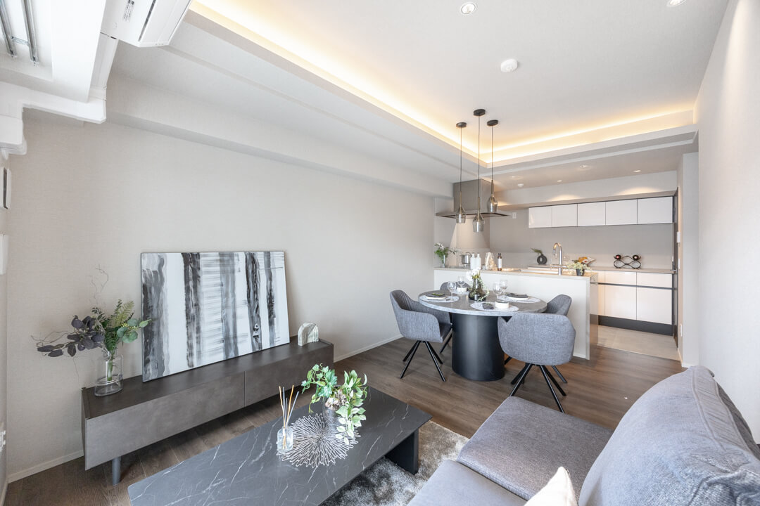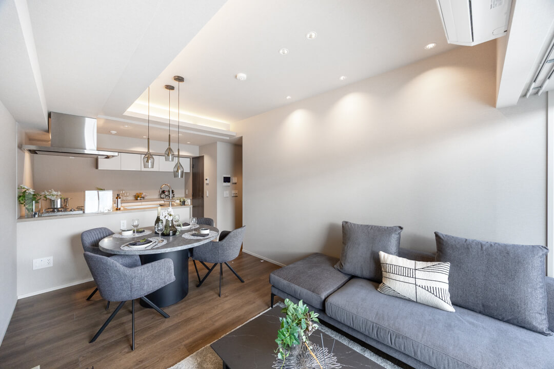 約12.4帖のリビングダイニングキッチンです。天井には間接照明が設置されており、お部屋を上品な雰囲気に包んでくれています。また、南向きのため日当たりも良好です。