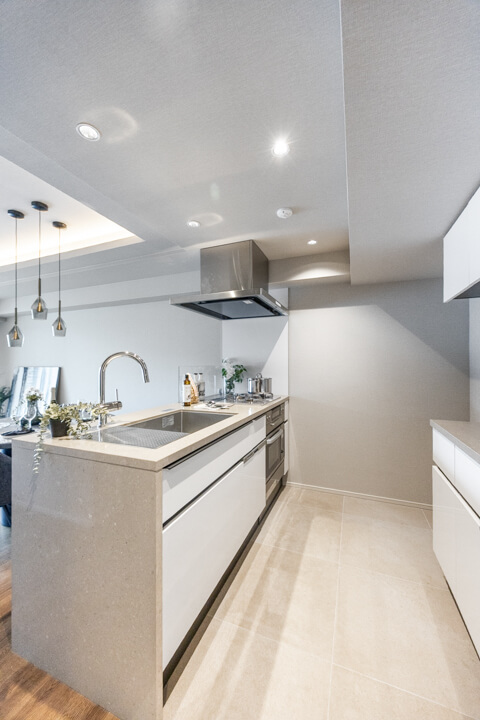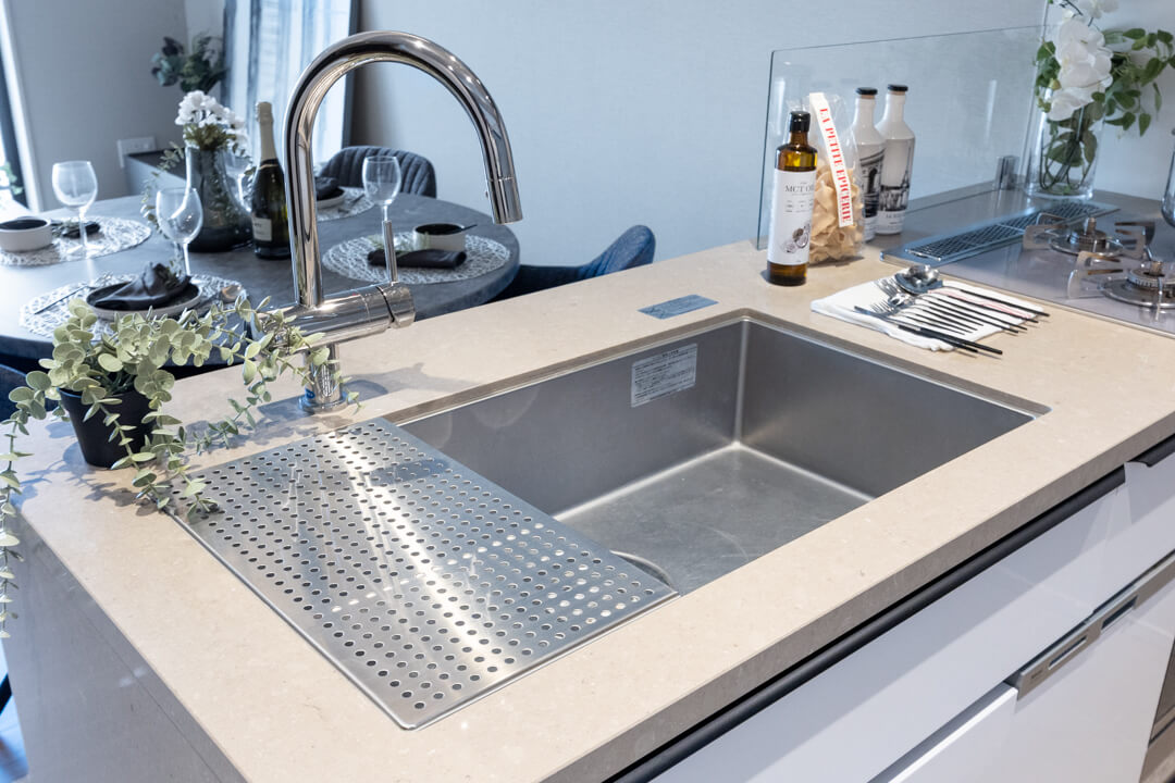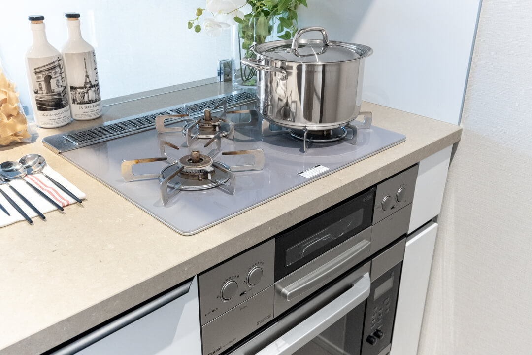 3口コンロ、グリル、ディスポーザー、オーブン、食洗機付きと設備面も充実しています。シンクも広々としているので野菜などが洗いやすそうですよ。