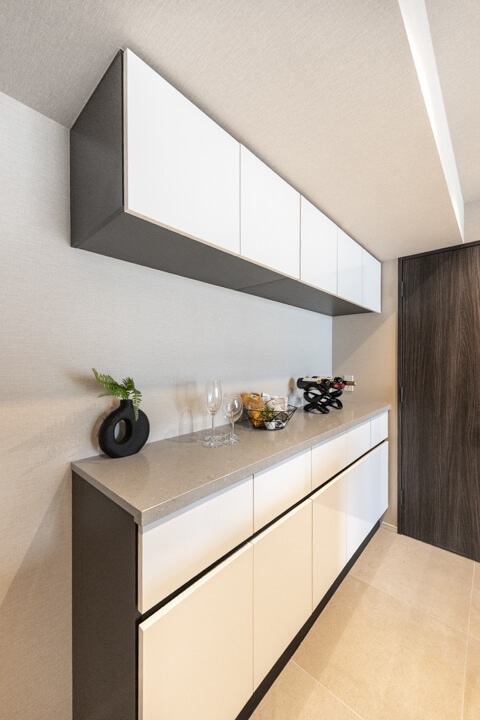 キッチンの背面側にはカップボードが備え付けられています。調味料や食器などを収納できるだけでなく、電子レンジなどを置くこともできるので便利です。