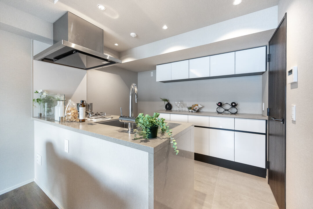 キッチンは、リビングダイニングを見渡しながら料理ができる対面式です。家族や来客とのコミュニケーションが取りやすくて◎。また、約0.3帖の納戸が造られており、ストック類などを収納することもできそうです。