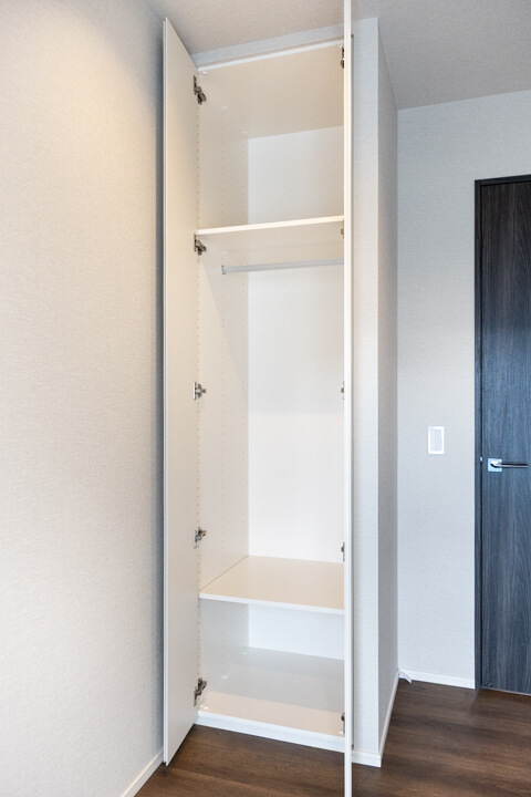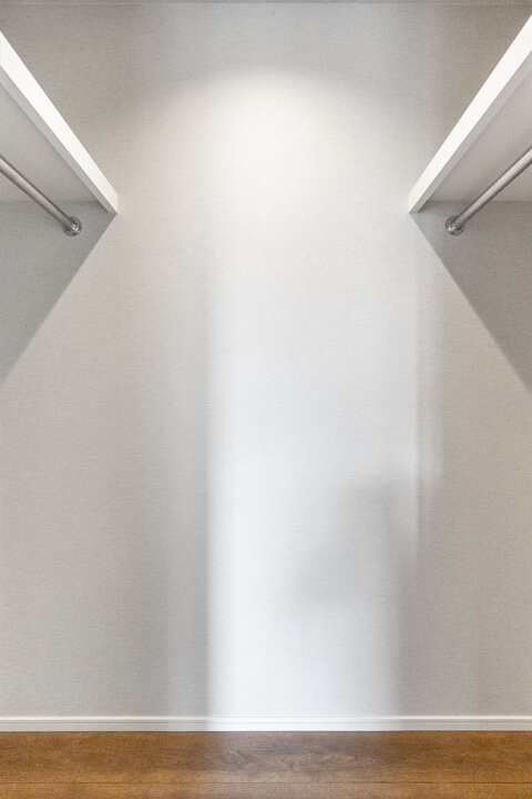 約5.7帖の主寝室にはウォークインクローゼットが造られています。両サイドにパイプハンガーと棚板が設置されているので、たくさんの洋服を収納することができそうです。また、床暖房付きのため、足元から温まることができます。