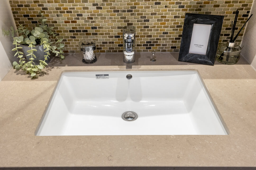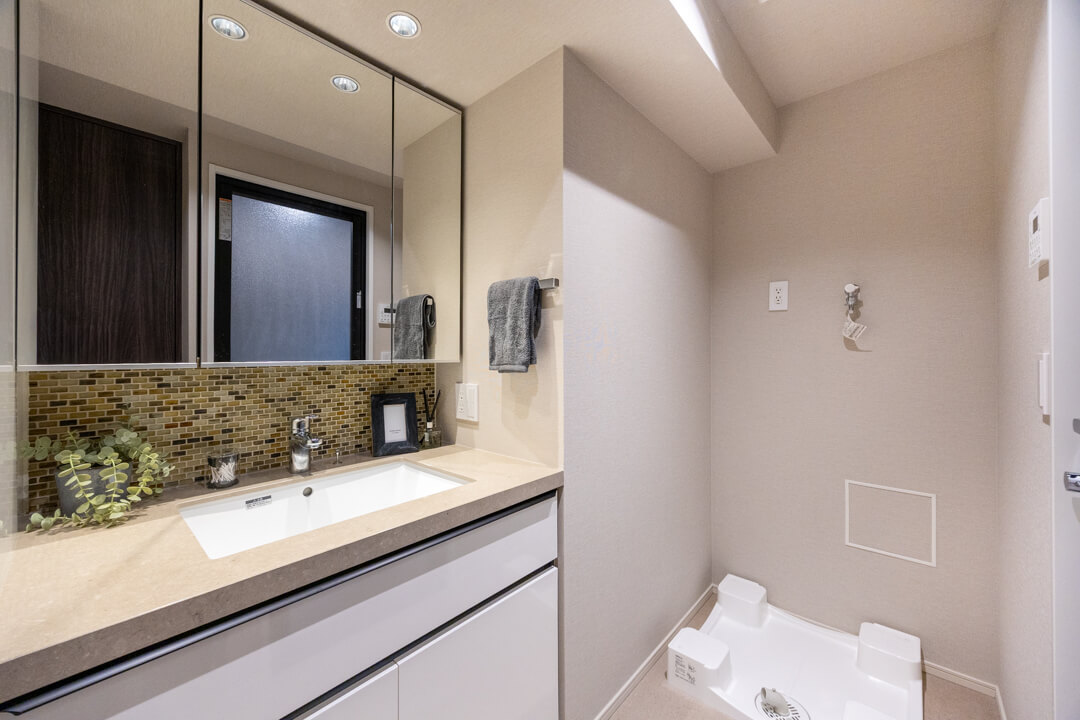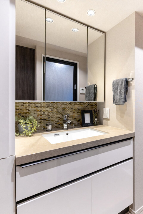 モザイクタイルがアクセントになっている洗面化粧台です。三面鏡の中には化粧品などが収納できて使い勝手良好。横には棚が造られているので、ごちゃごちゃしがちな洗面まわりもきちんと整頓することできます。