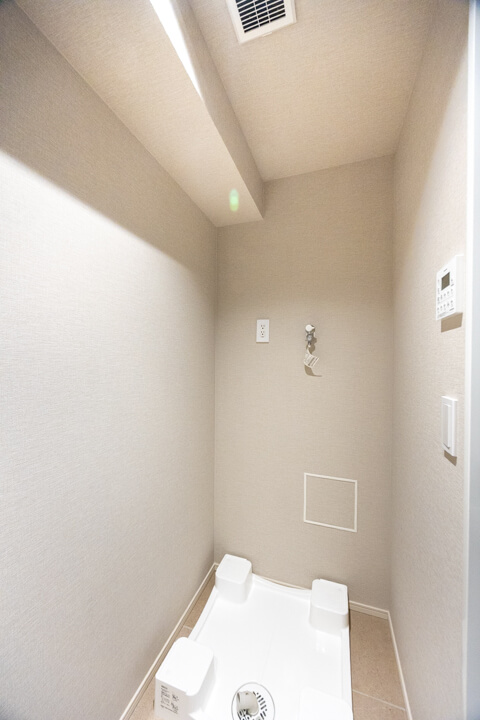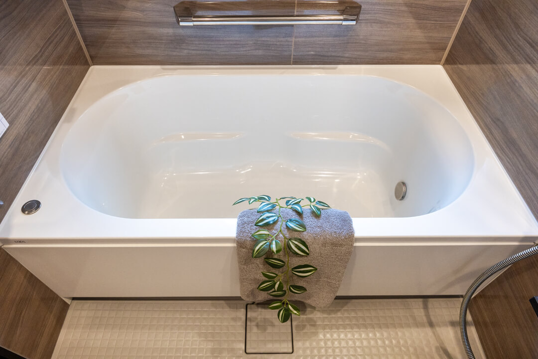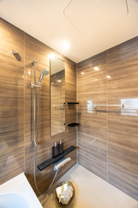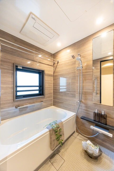 ブラウンの壁パネルが落ち着いた雰囲気を演出してくれている浴室です。お風呂にゆっくり浸かるのが好きという方に嬉しい追い焚き機能を搭載。家族の入浴時間がずれてしまっても安心です。また、浴室乾燥機には暖房・乾燥・換気・涼風の機能がついており、一年中快適に過ごすことができます。さらに、窓も付いているので、自然換気もしやすそうです。