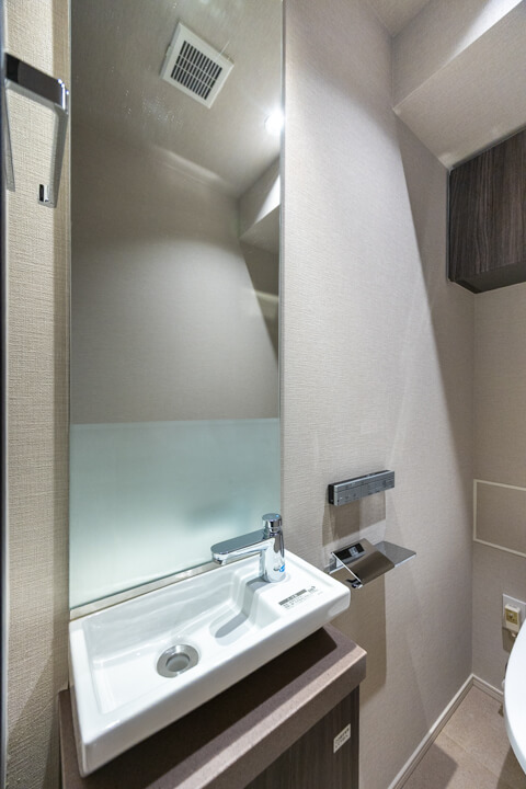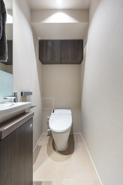 ウォシュレット一体型のトイレです。タンクレスタイプなのですっきりとした印象に。また、別途で手洗い器や鏡が造られているので、その場でサッと身だしなみを整えることができます。上部には吊戸棚が設置されていて、収納スペースもありますよ。