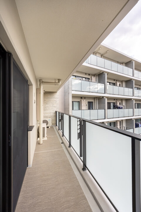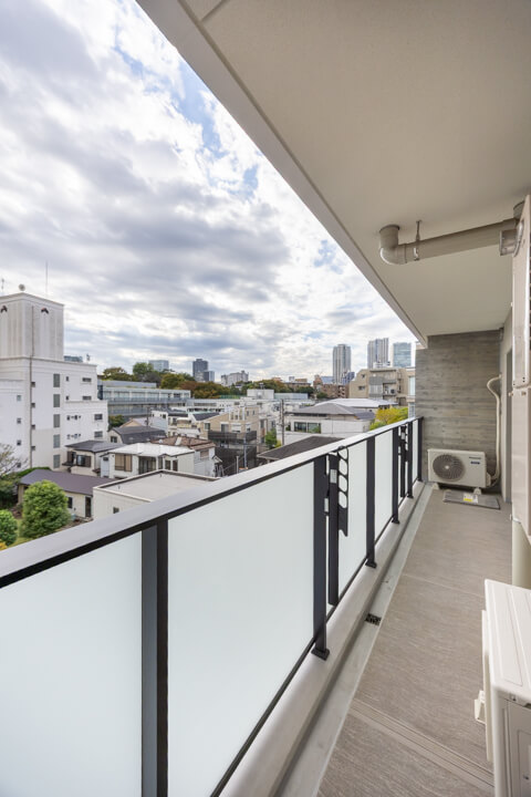 約8.89㎡のバルコニーは南向きのため日当たりが良好です。5階部分で目の前には、抜け感があり、緑も見える眺望が広がっています。