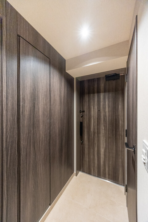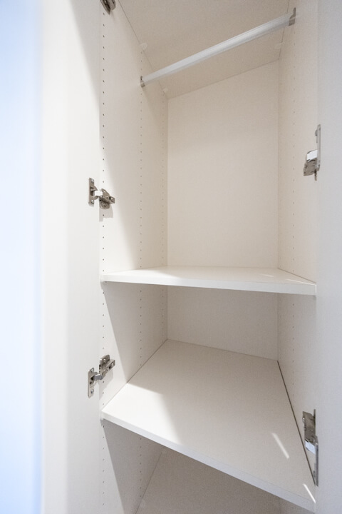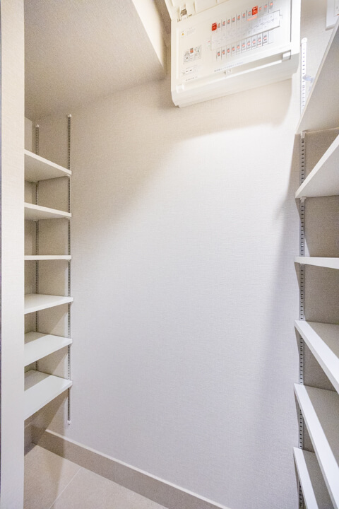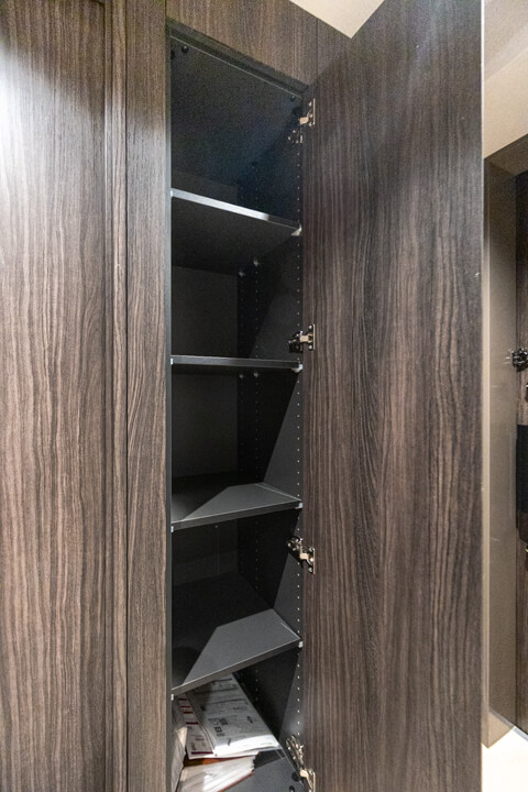 玄関入って左側にはシューズインクローゼットが造られています。お気に入りの靴を収納できたり、アウトドアグッズなどを収納できたりと便利なスペースです。反対側には収納棚が設置されています。