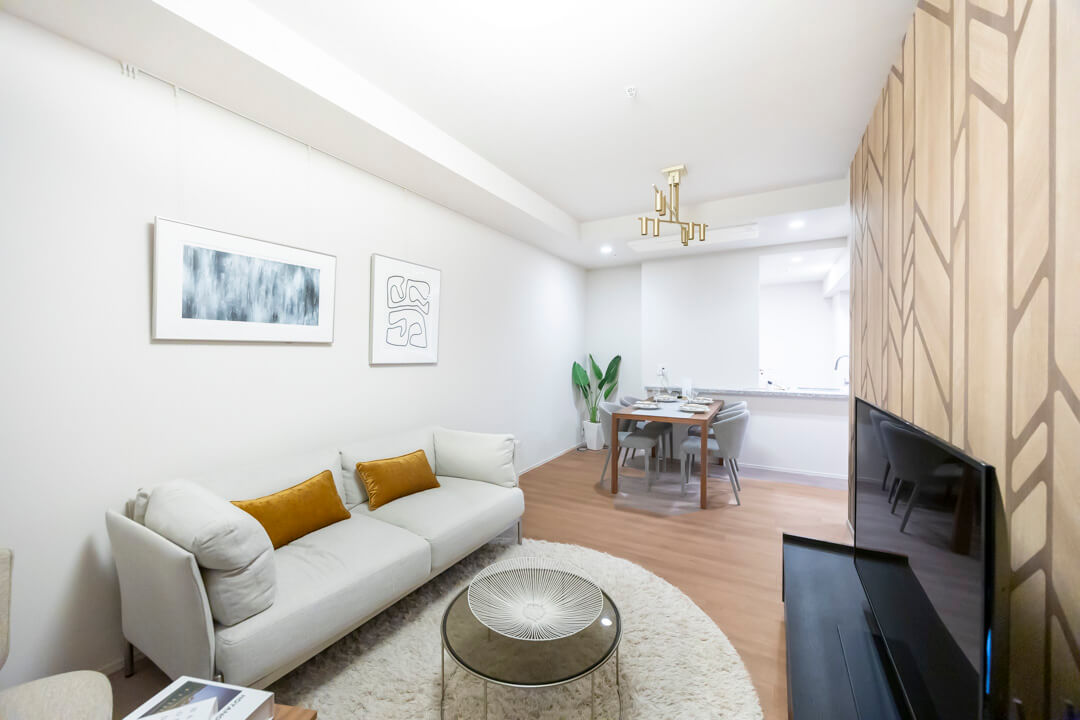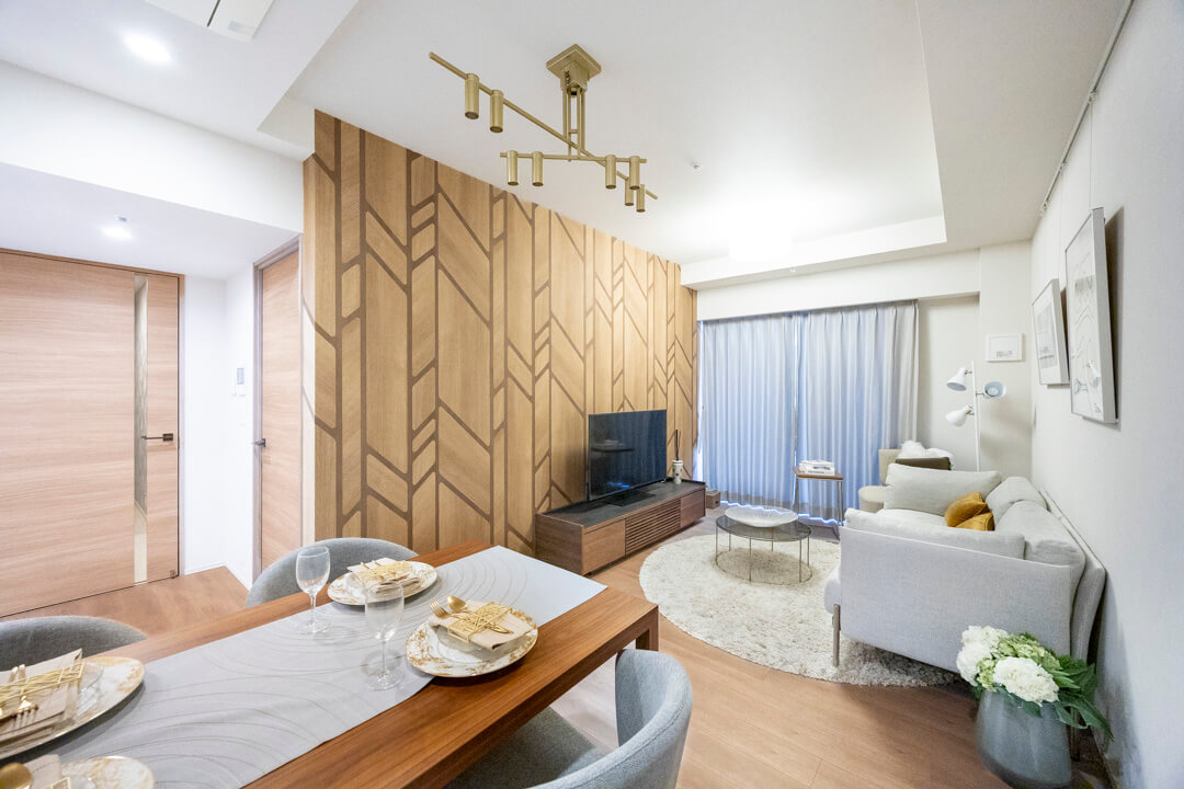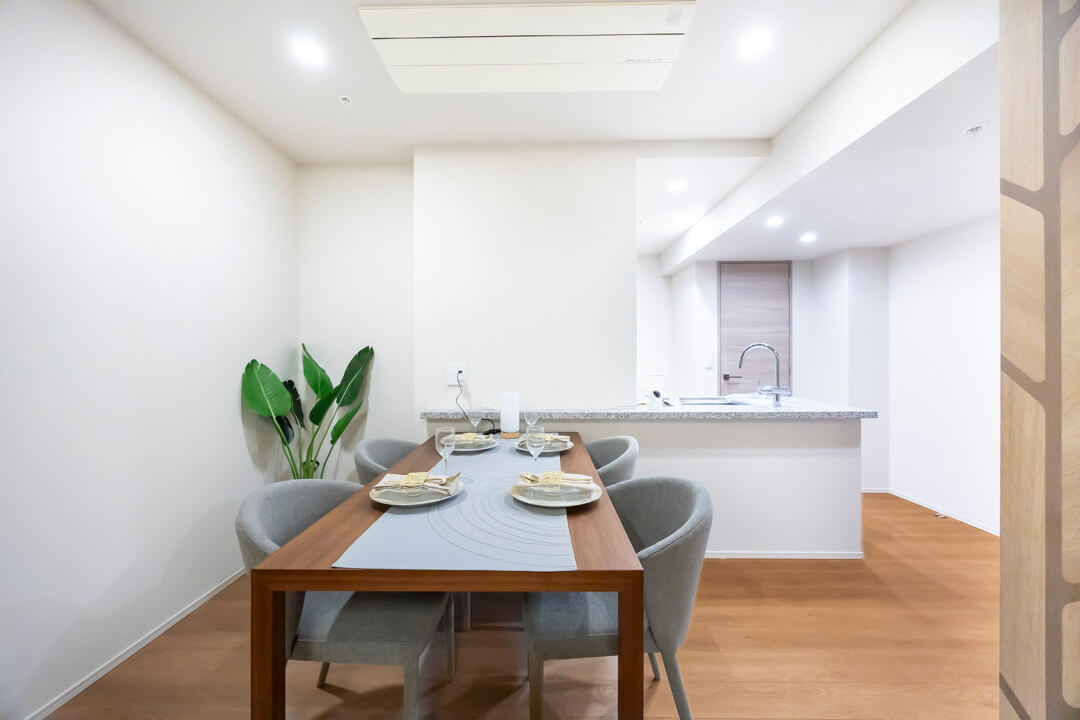 ゆとりのあるリビングダイニングキッチンです。壁面にはデザイン性のあるアクセントウォールがあしらわれています。また、ピクチャーレールも設置されているので、壁を傷つけずに絵画などを飾ることができますよ。エアコンは埋め込み式のため、お部屋の雰囲気を壊しません。