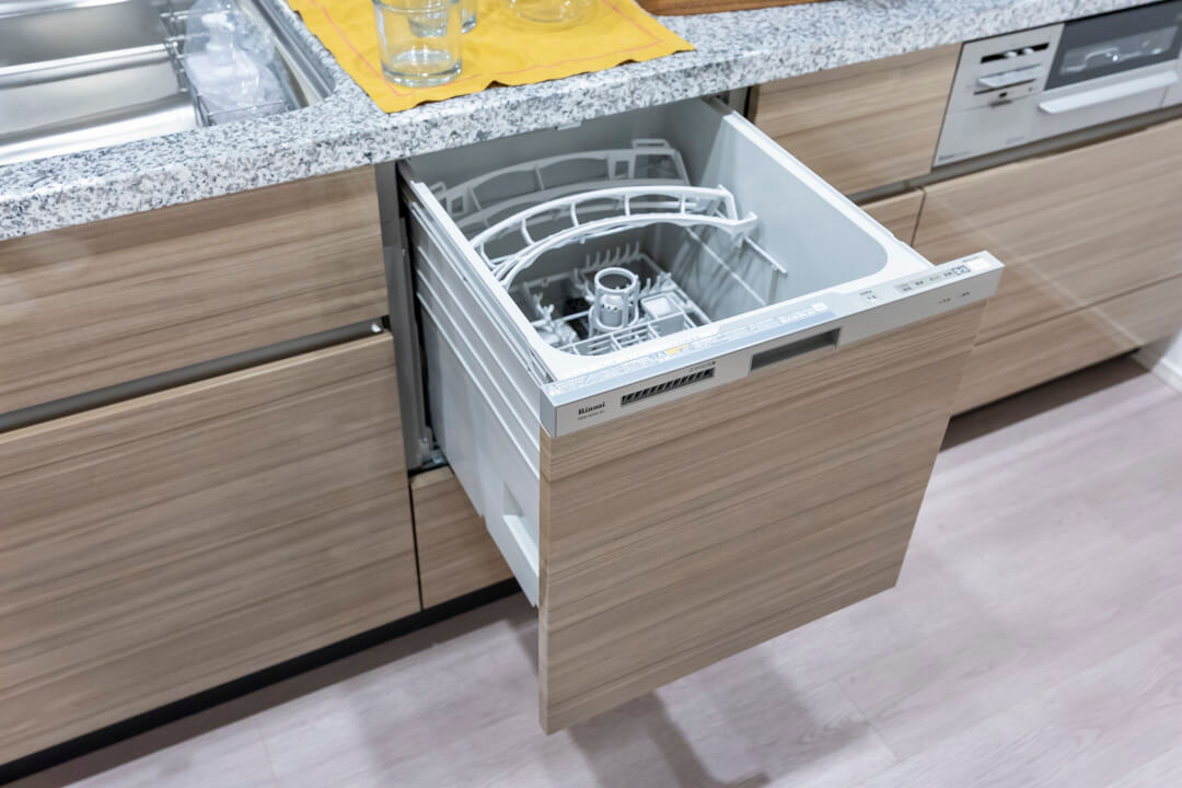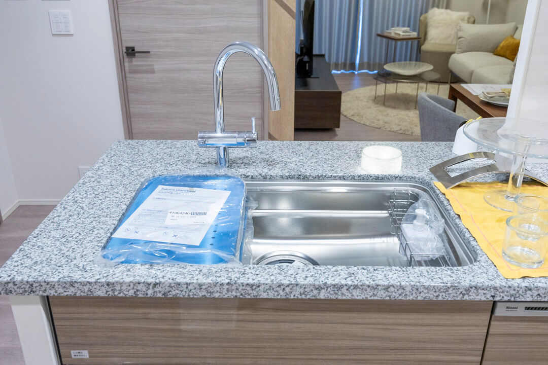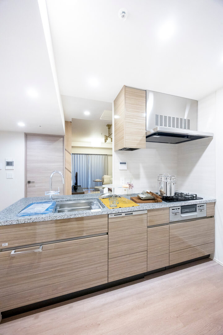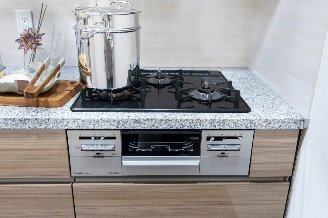 3口コンロ、グリル、ディスポーザー、食洗機付きと設備面も充実しています。シンクも広々としているので野菜などが洗いやすそうですよ。