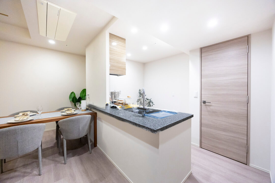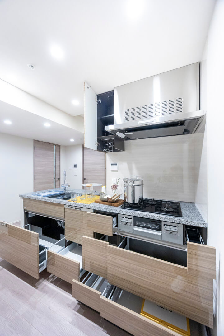 キッチンは、リビングダイニングを見渡しながら料理ができる対面式です。家族や来客とのコミュニケーションが取りやすくて◎。しかし、コンロ側には壁がたっているので、油跳ねなどの心配はありません。