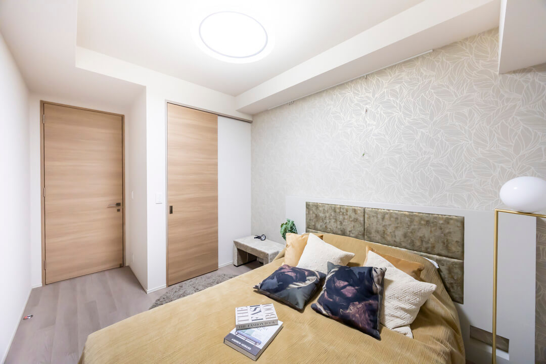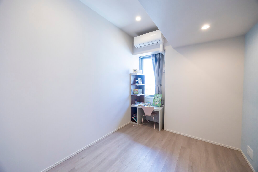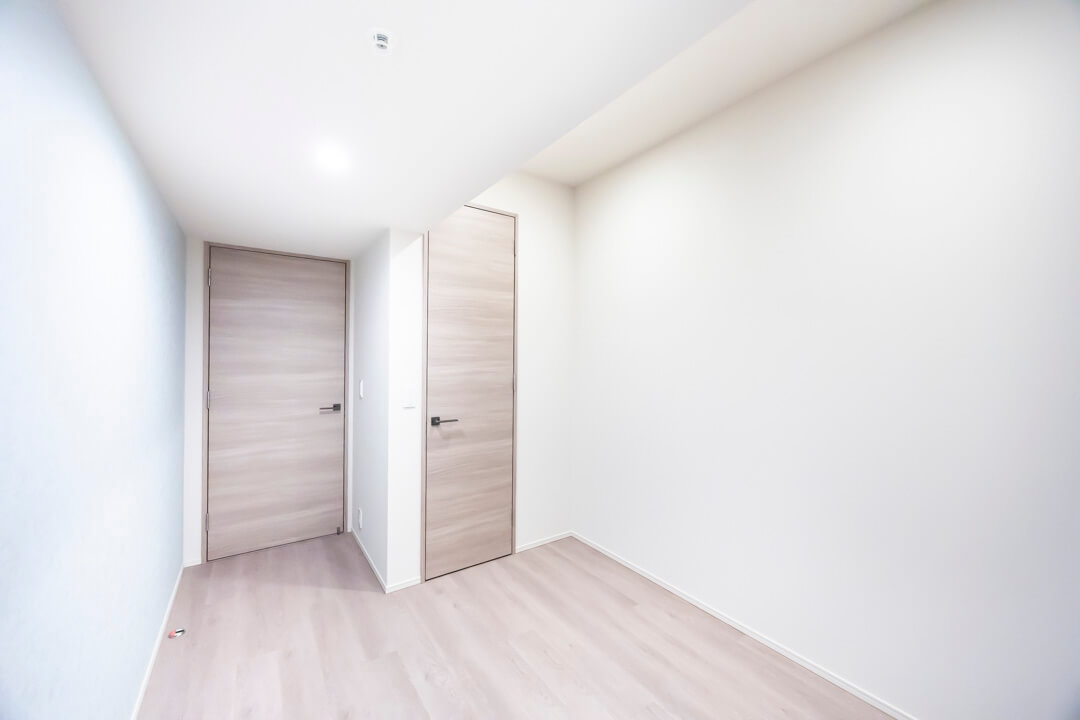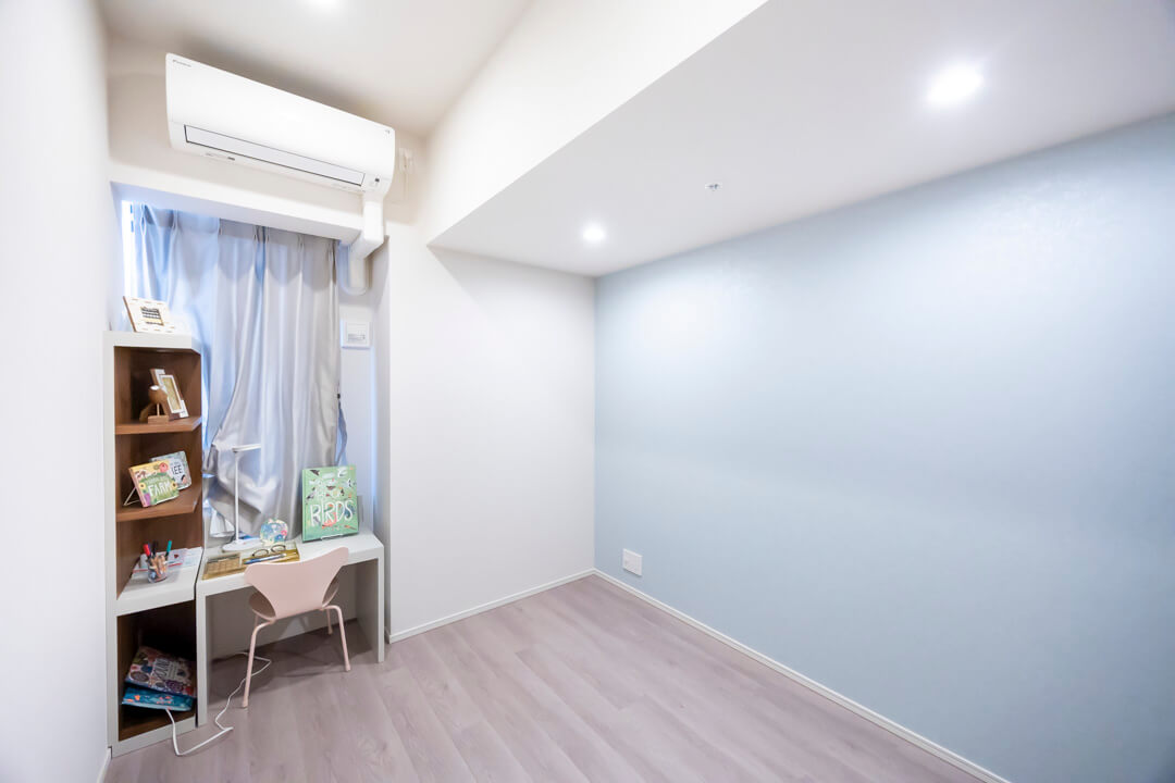 くすみブルーのクロスで爽やかな印象となっている寝室2です。クローゼット付きで収納スペースも確保されています。子ども部屋や書斎など、色々な使い方ができそうですよ。