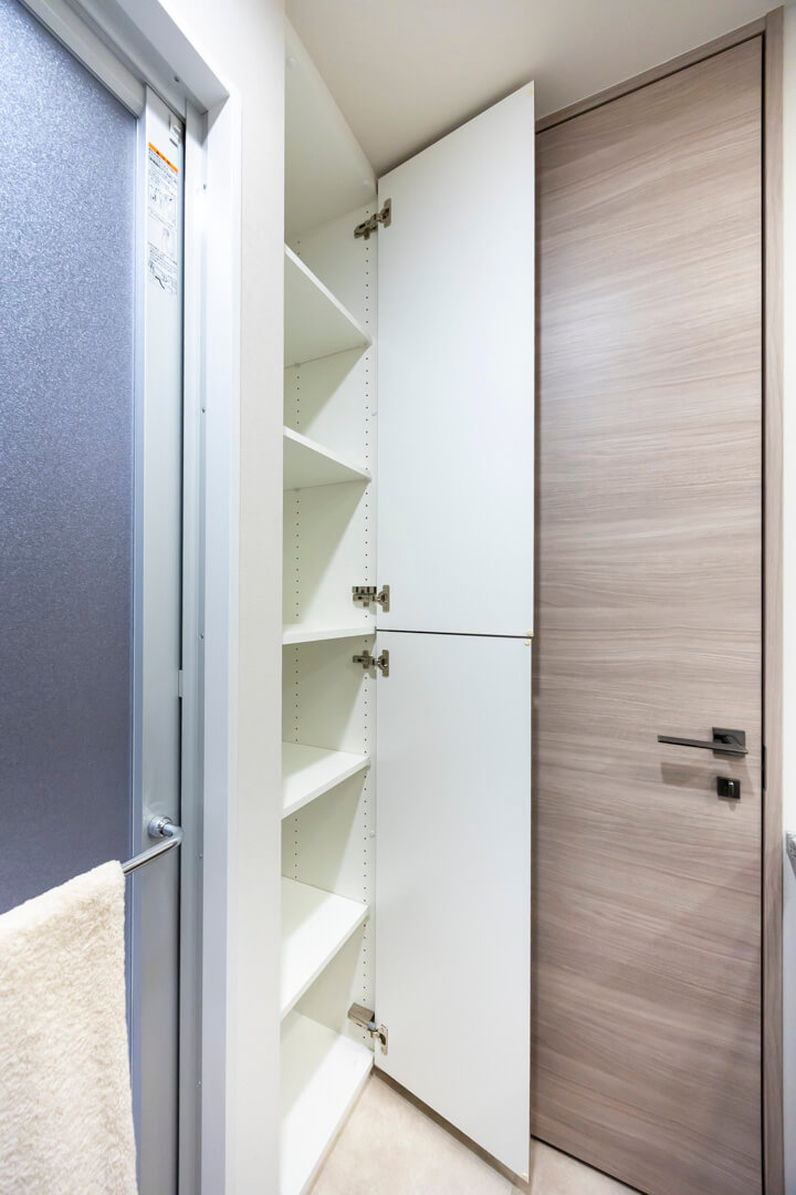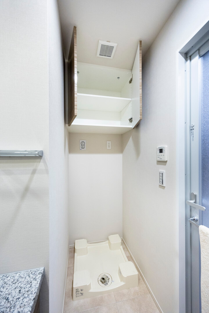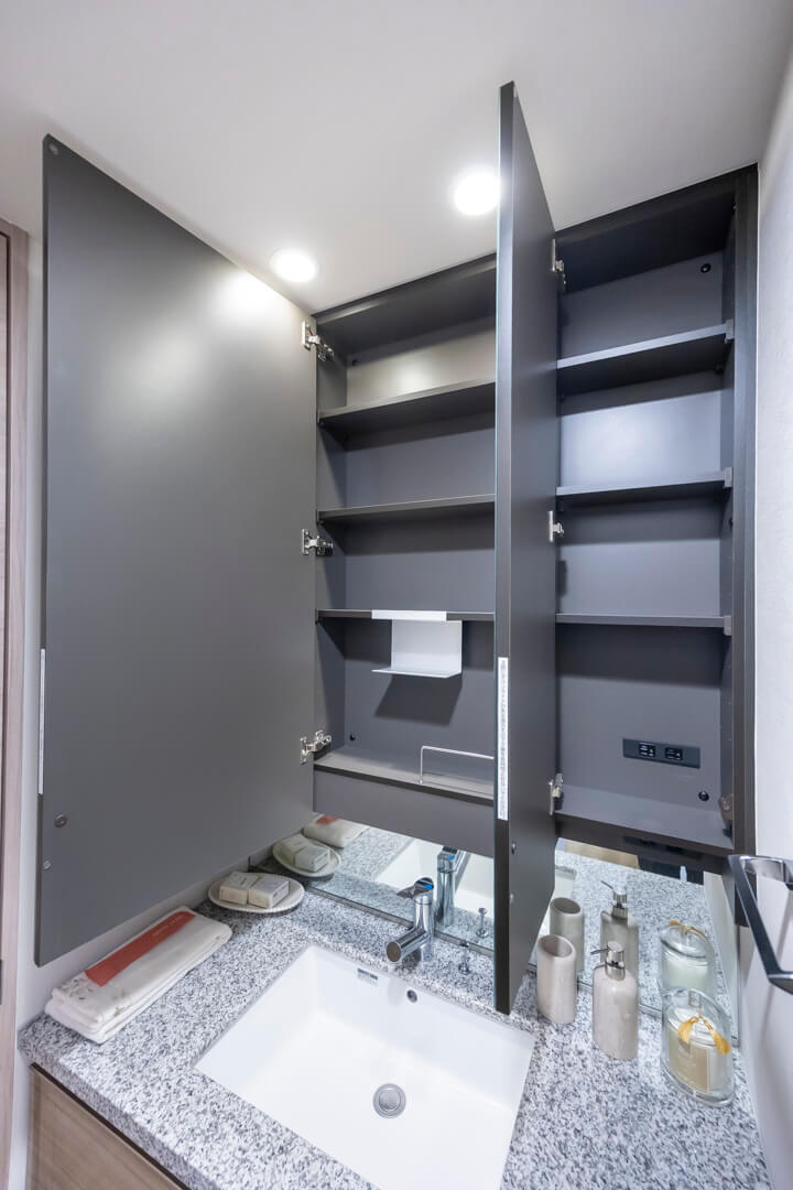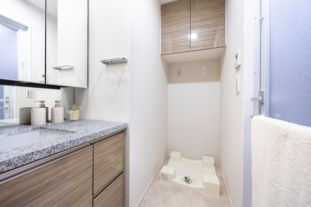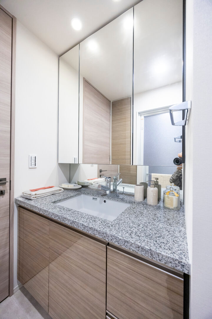 石目調のカウンターで高級感のある洗面化粧台です。大きな三面鏡の中には化粧品などが収納できて使い勝手良好。背面側にはリネン庫が造られているので、ごちゃごちゃしがちな洗面まわりもきちんと整頓することができます。
