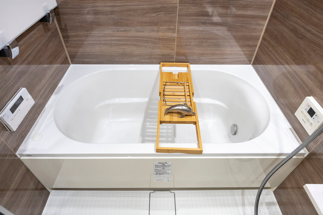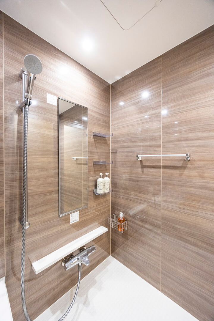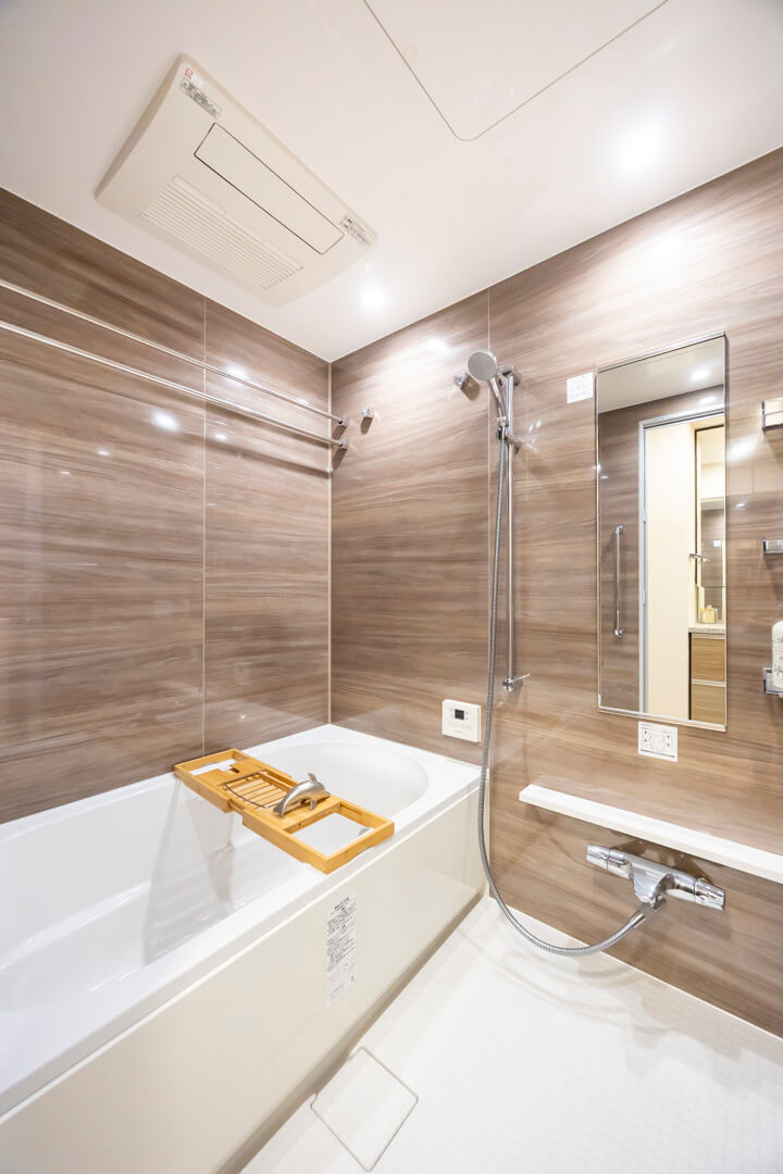 ブラウンの壁パネルが落ち着いた雰囲気を演出してくれている浴室です。お風呂にゆっくり浸かるのが好きという方に嬉しい追い焚き機能を搭載。家族の入浴時間がずれてしまっても安心です。また、浴室乾燥機には暖房・乾燥・換気・ミストサウナの機能がついており、一年中快適に過ごすことができます。