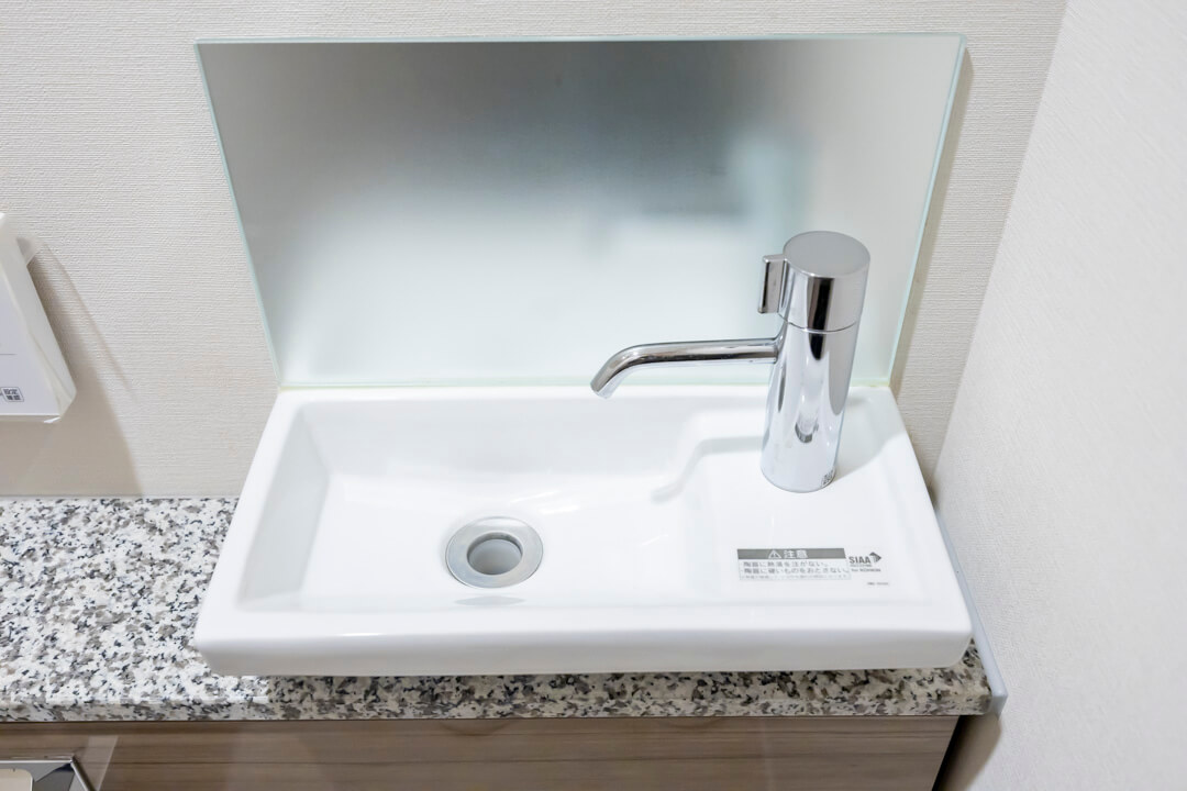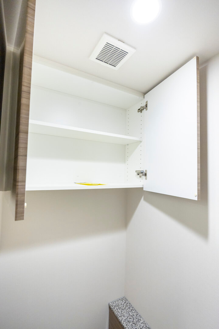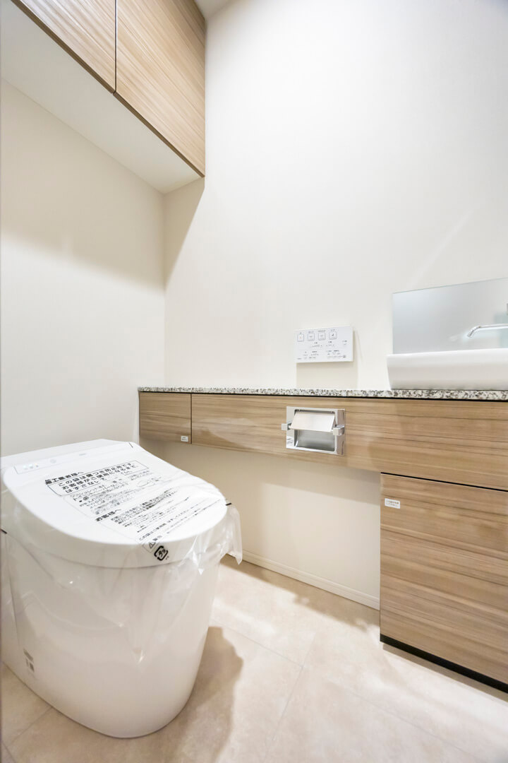 ウォシュレット一体型のトイレです。タンクレスタイプなのですっきりとした印象に。また、別途で手洗い器が造られているので、すぐに手を洗うことができて衛生的です。上部には吊戸棚が設置されていて、収納スペースもありますよ。カウンタースペースにはアロマなどを置いても◎。