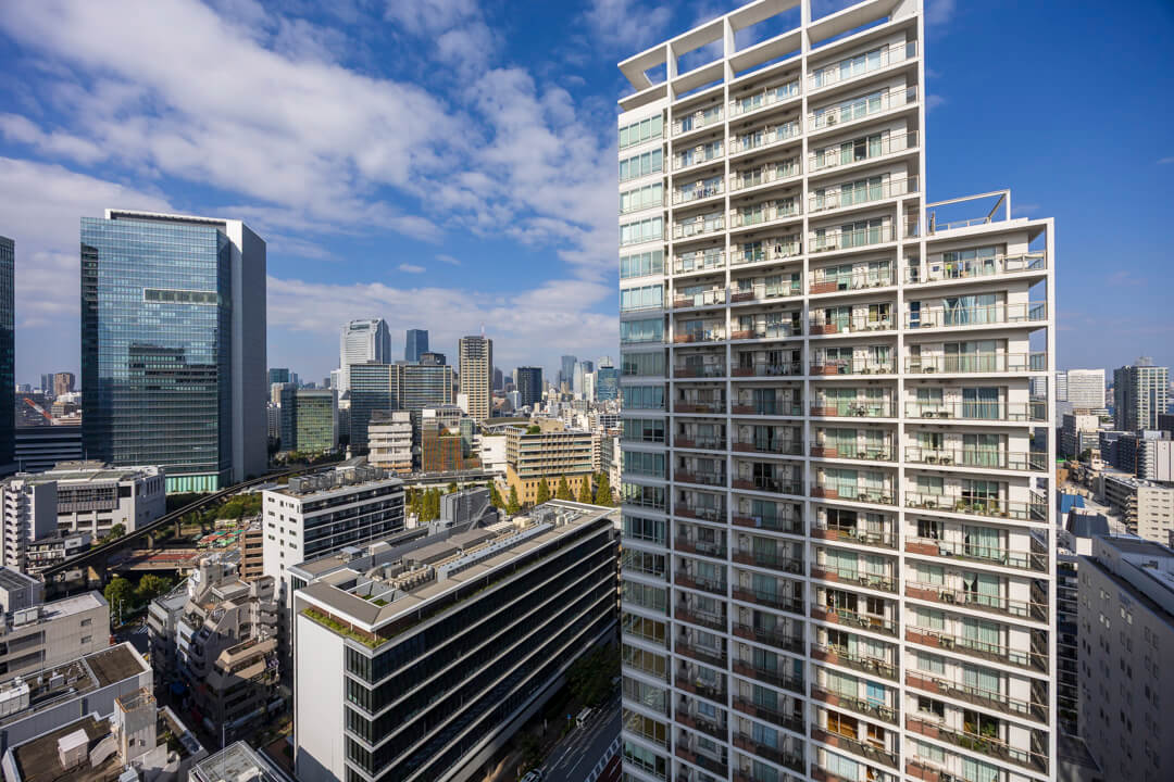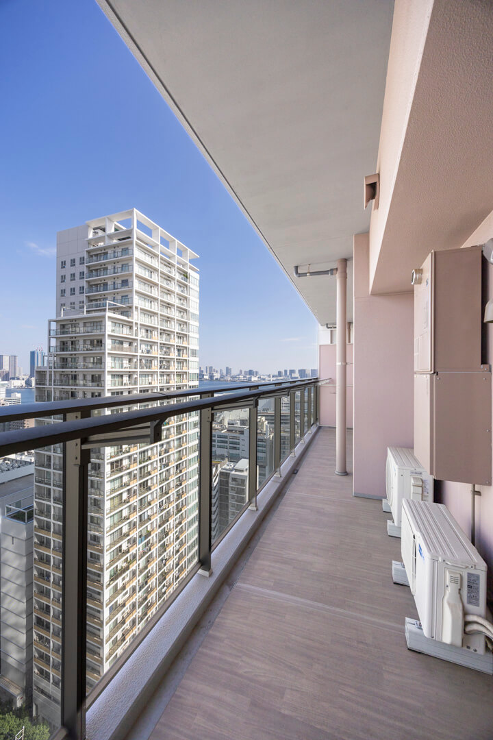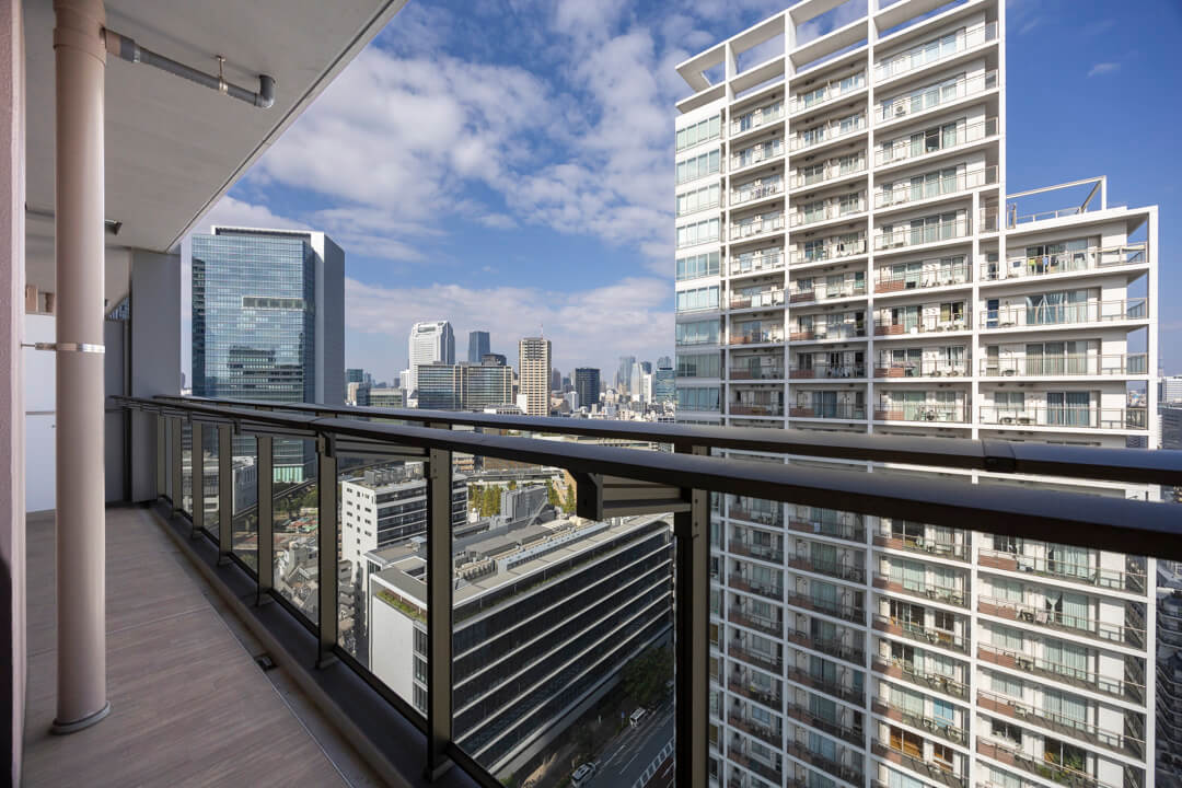 約14.43㎡の広々としたバルコニーです。21階部分で、目の前には都会的なビル群の中に、東京湾の潤いを感じる眺望が広がっています。チェアなどを置いてほっと一息つく、くつろぎの空間にも◎。