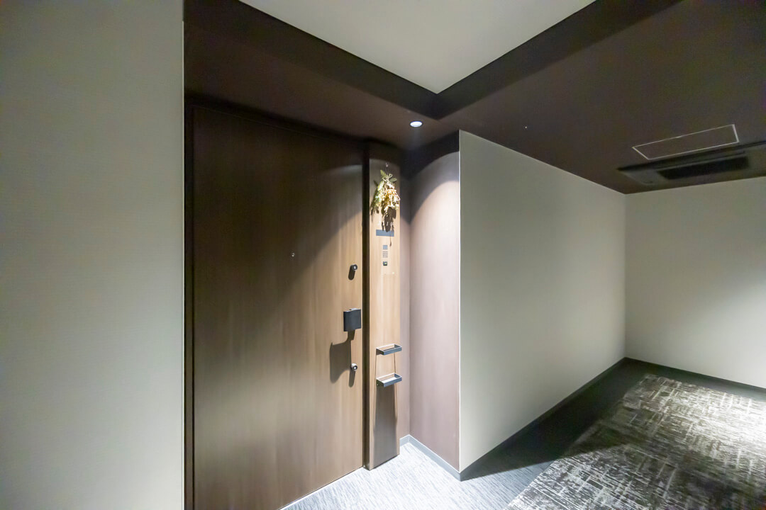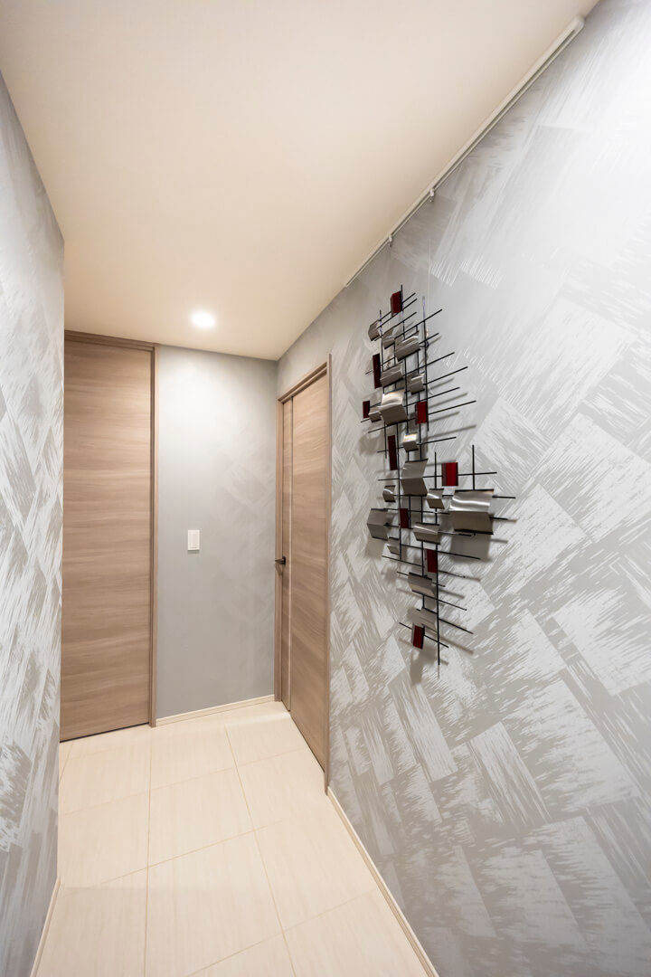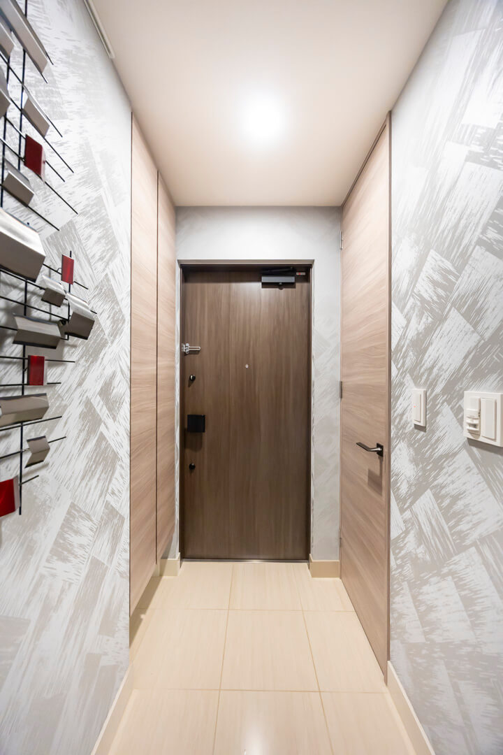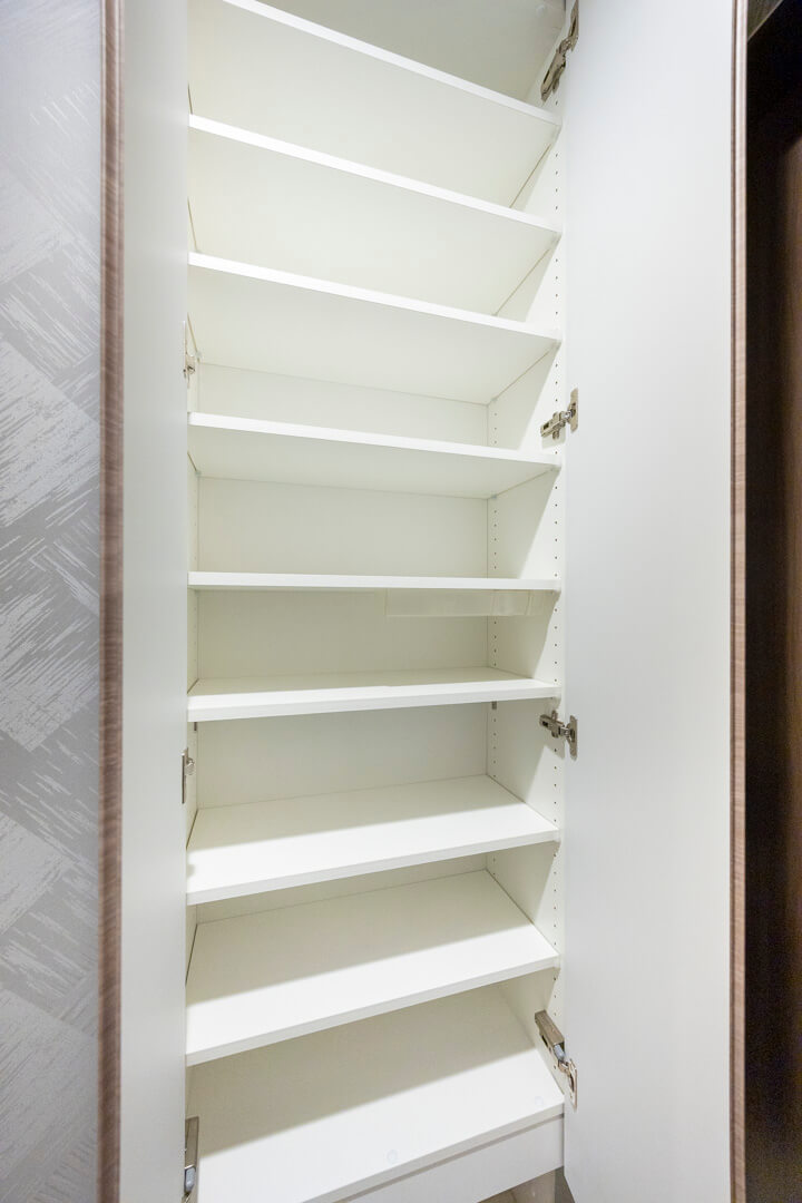 スタイリッシュな雰囲気の玄関には、シューズインクローゼットが造られています。中には可動棚が設置されているので、お気に入りの靴に合わせて調節することができますよ。傘立てスペースもあって便利です。さらに、反対側には玄関収納もあって◎。