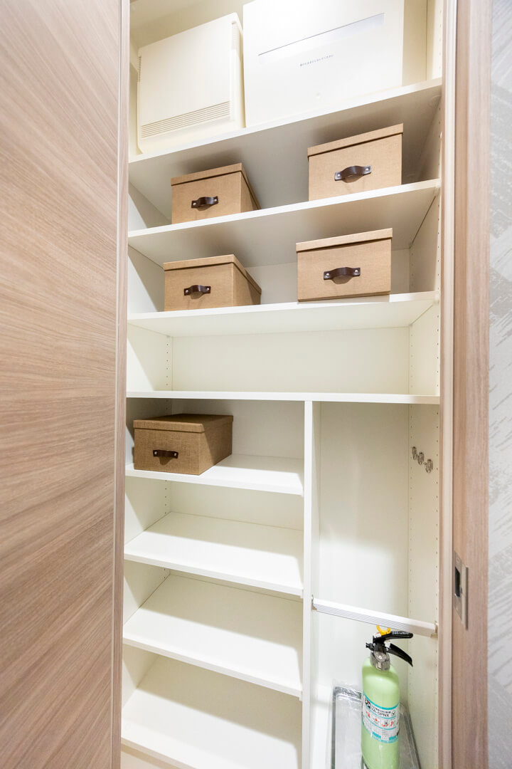 キッチンの背面側には大きめの家電やストック類などを収納できそうなスペースが造られています。