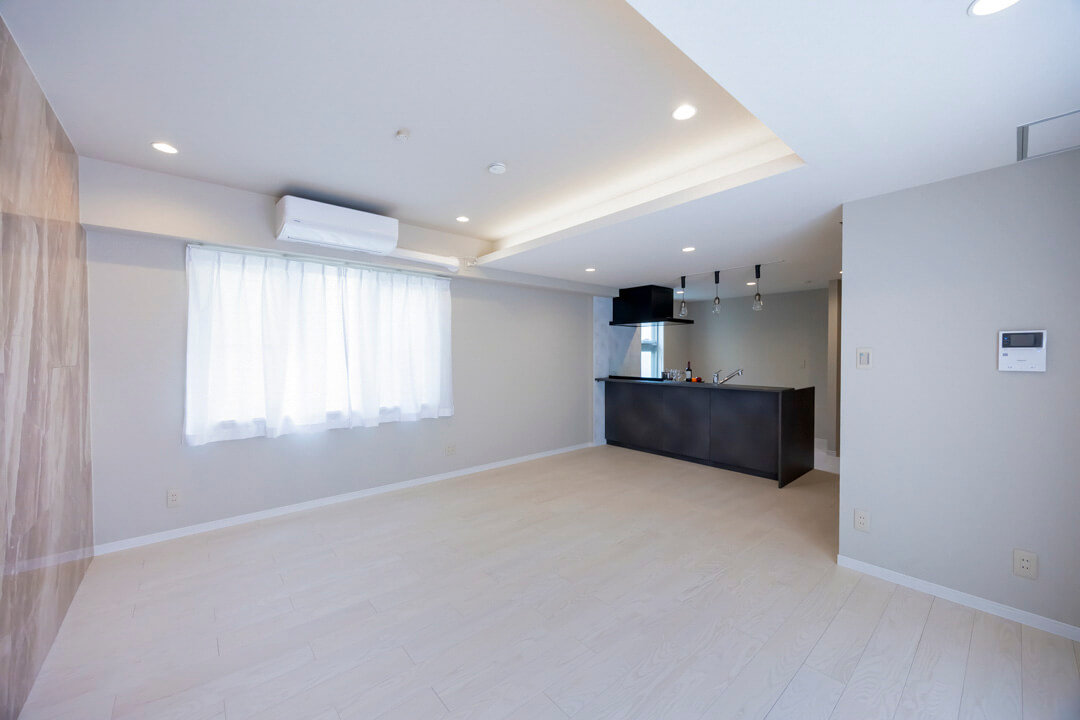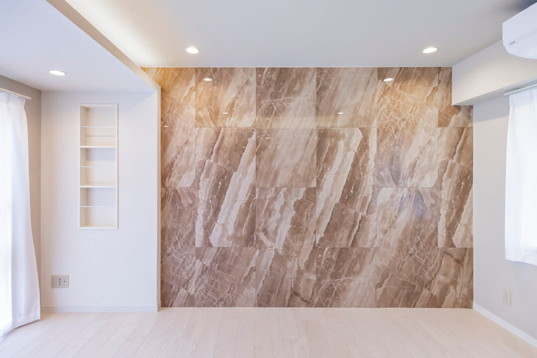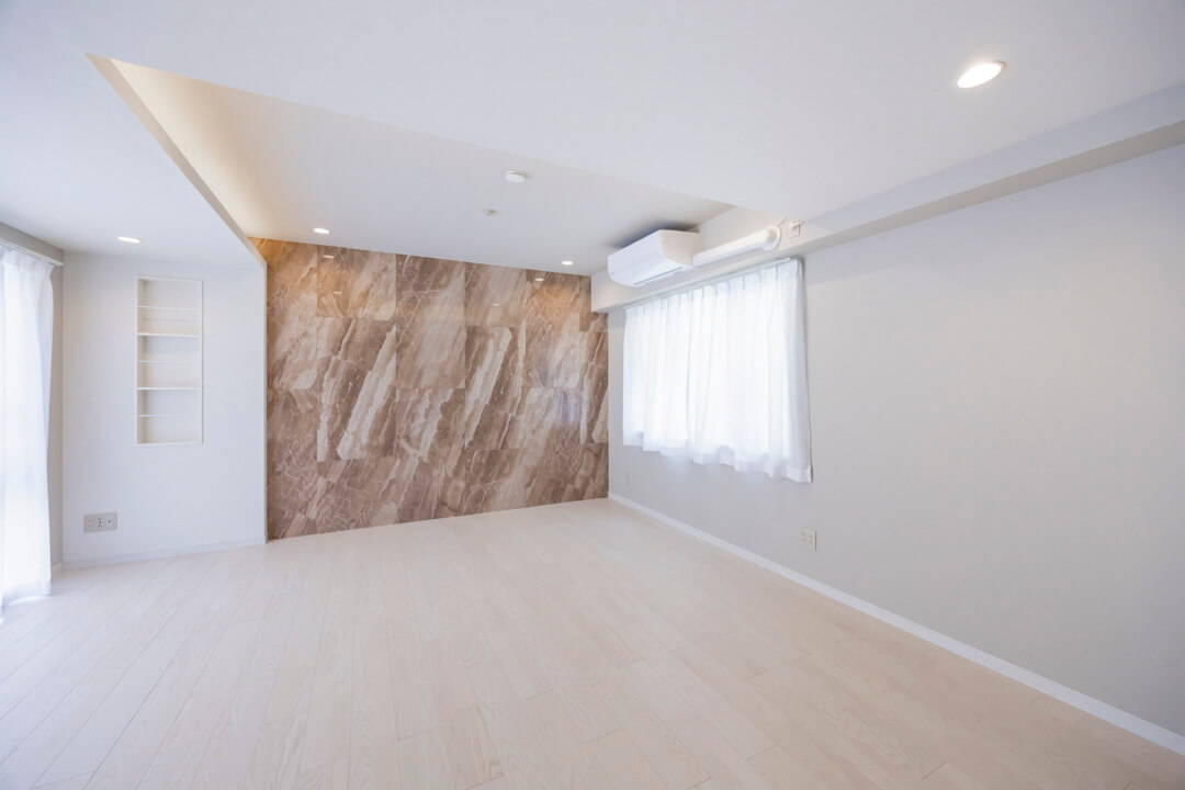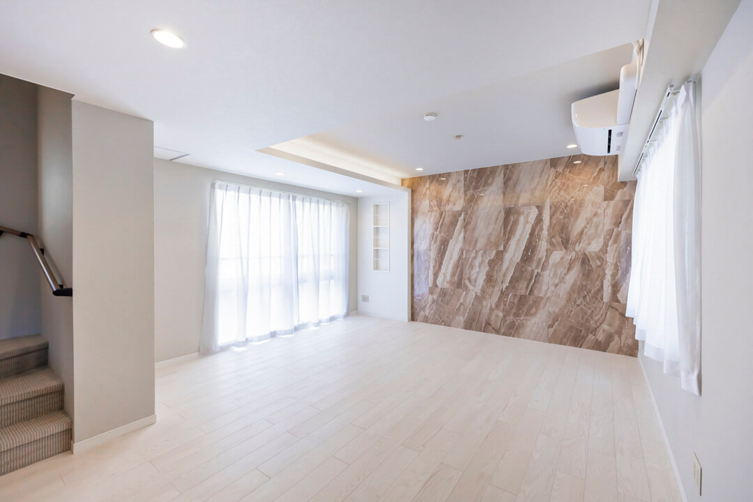 2階部分にあるLDK。約17.8帖の広々とした空間です。東西2面採光で明るく風通し良好◎。ストーン調のアクセントウォールや間接照明のやわらかな明かりが、洗練された雰囲気を演出します。フローリングは自然な風合いの木目柄で、さまざまなテイストの家具と相性が良さそうです。