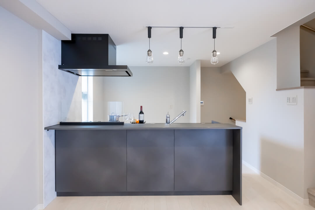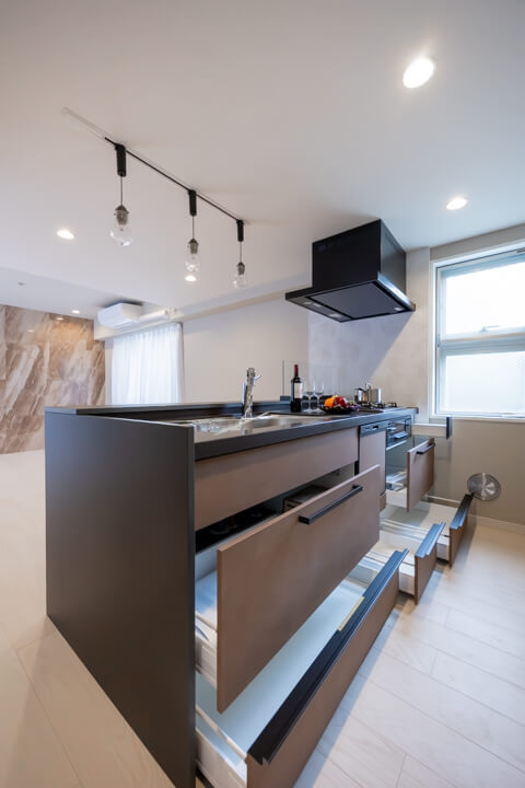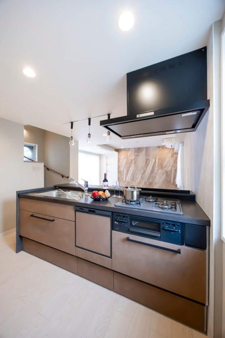 ダークトーンで重厚感の漂うキッチン。リビングダイニングを見渡すことができ、開放的な気分で調理ができます。家族やゲストとコミュニケーションが取りやすいのも嬉しいですね。