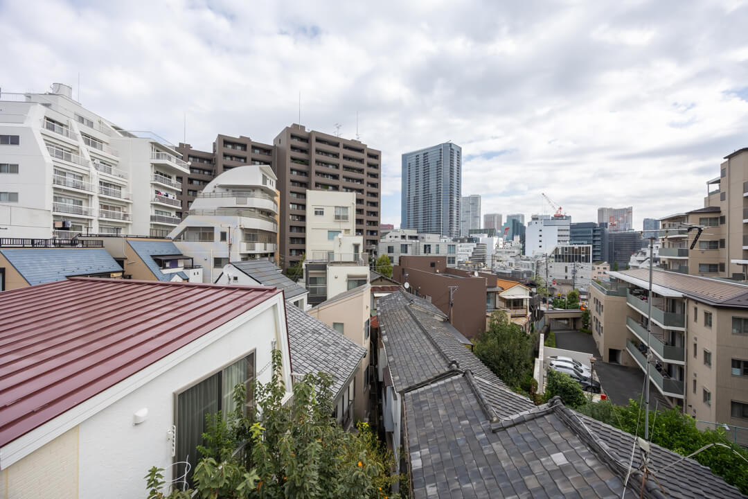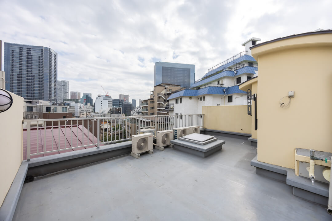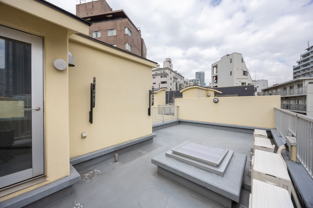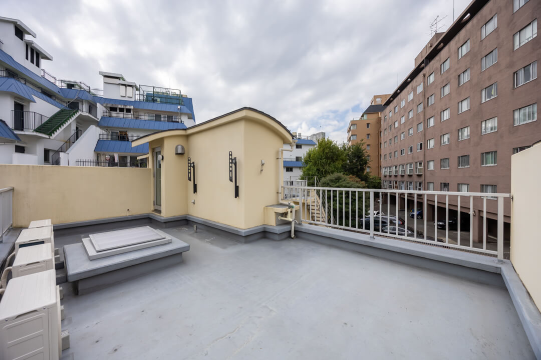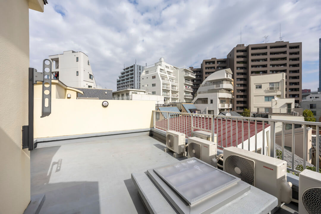 屋上には30㎡弱のルーフテラスがあります。眼下には低層の建物が多く、広い空を仰ぐことができます。テーブルやチェアを置いて休日のブランチ、夜にはまったりお酒を飲んだりと、開放的なリフレッシュタイムを過ごせそうですね。物干し金物や蛇口付きなのも嬉しいポイントです。