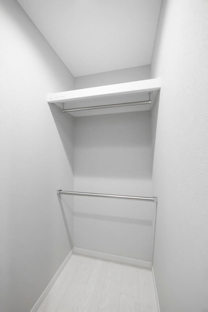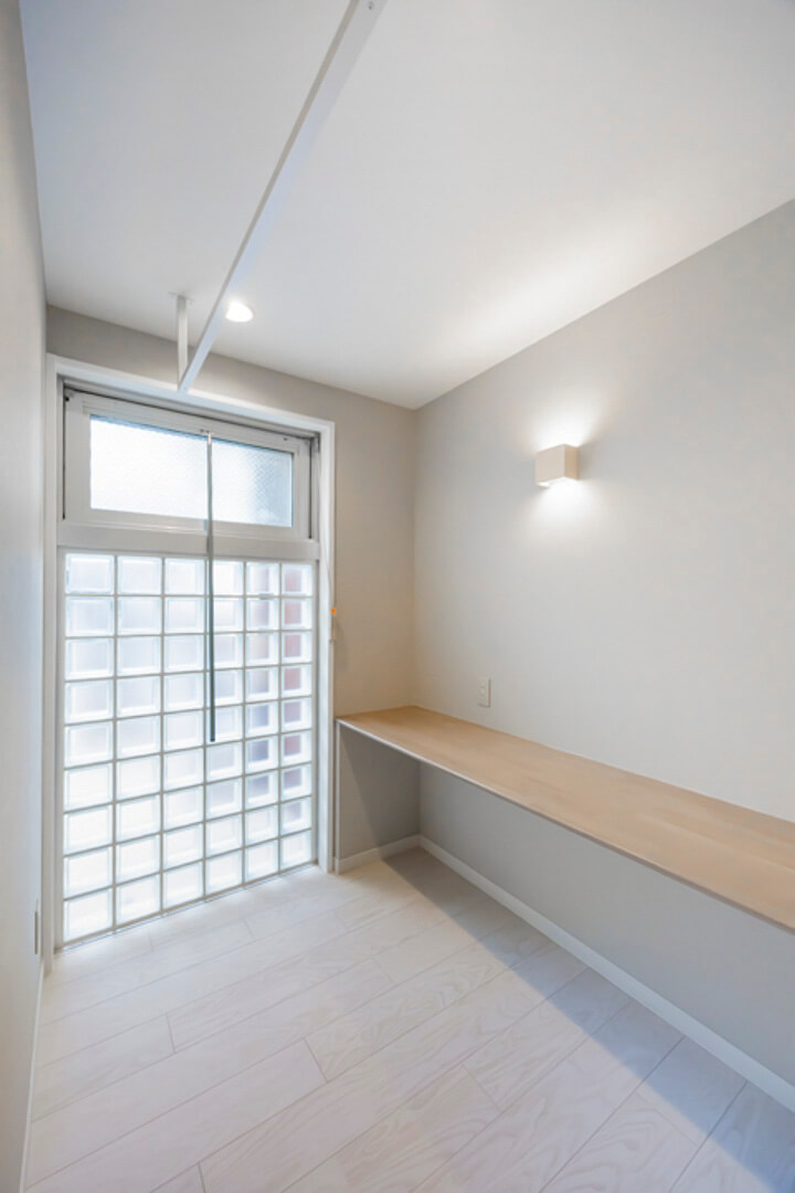 約6.5帖の寝室3。1階部分にあり、独立性の高い空間です。こちらにもWIC(ウォークインクローゼット)があり、居室部分を広々と使うことができますよ。奥には約2.0帖の書斎を完備。ガラスブロックから心地よい光が入り、ほど良いこもり感で作業に集中できそうです。ハンガーパイプが備え付けなので、室内干しにも便利なスペースです。