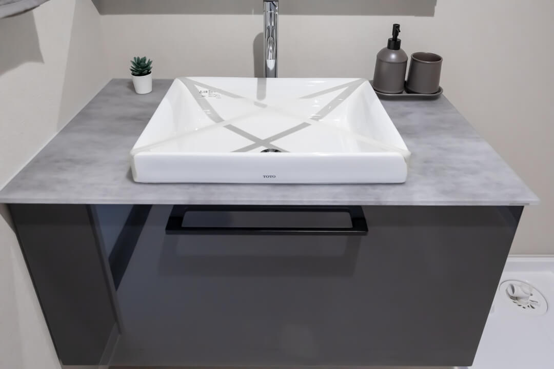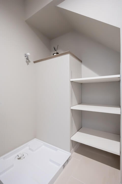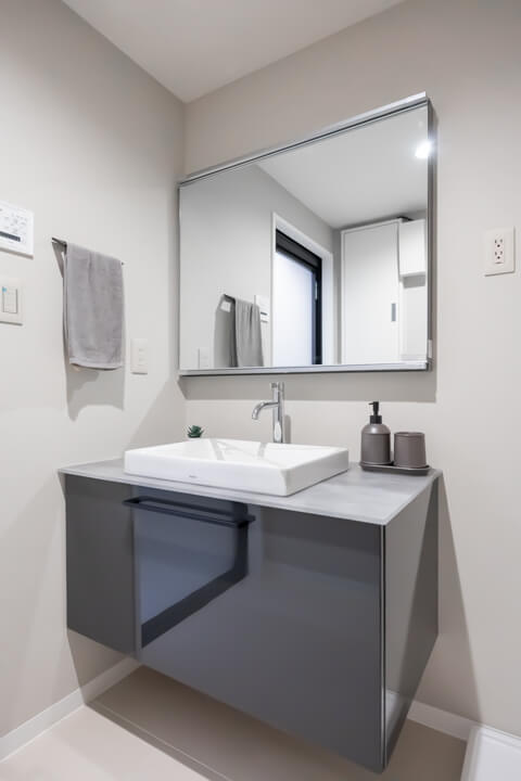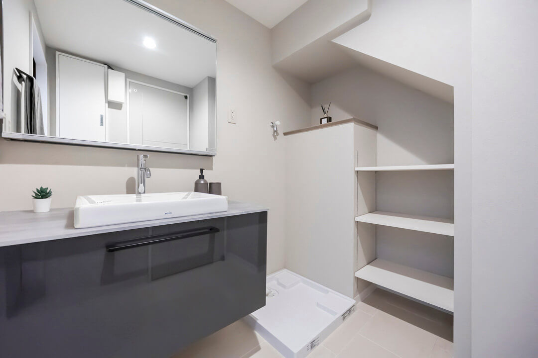スタイリッシュな雰囲気の洗面化粧台です。置き型式の洗面ボウルがおしゃれで◎。フロートタイプなのでお掃除もしやすく、体重計を収納しておくこともできます。横にある洗濯機置場には可動棚が設置されており、リネン類などを置くことができます。