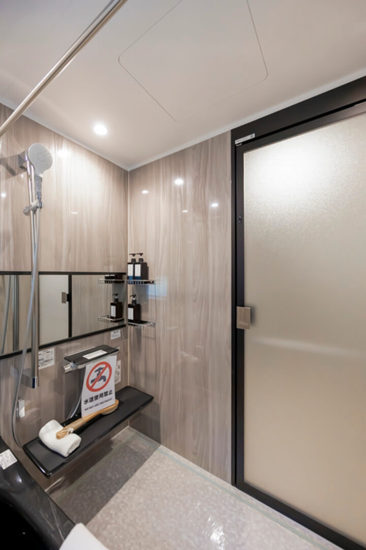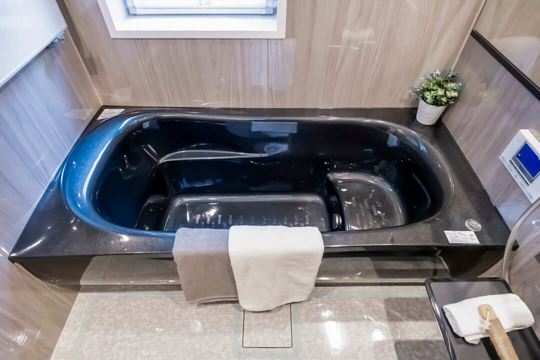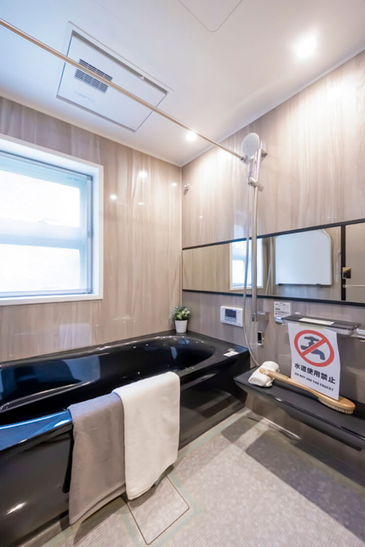 光沢感のあるブラウンの壁パネルが落ち着いた雰囲気を演出してくれている浴室です。1616サイズでゆったりと入浴することができ、ベンチ浴槽になっているので半身浴もしやすくなっています。また、追い焚き機能も搭載されており、家族の入浴時間がずれてしまっても安心です。浴室乾燥機には暖房・乾燥・換気・涼風の機能がついていて、一年中快適に過ごすことができます。窓もあるので、自然換気もしやすくなっています。
