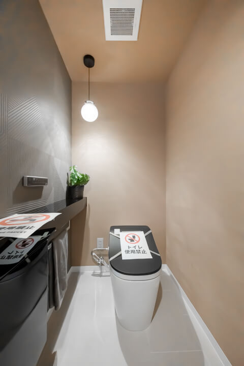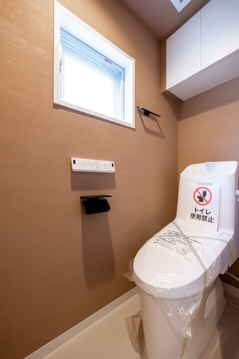トイレは1階と3階の2ヶ所に造られています。1階のトイレはウォシュレット一体型のトイレです。タンクレスタイプなのですっきりとした印象に。また、別途で手洗い器が造られているので、すぐに手を洗うことができて衛生的です。玄関近くにあるので来客時にも便利。