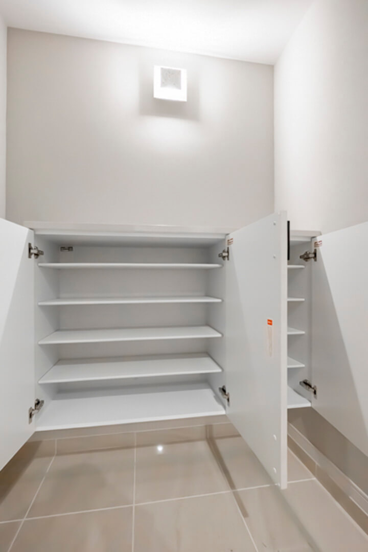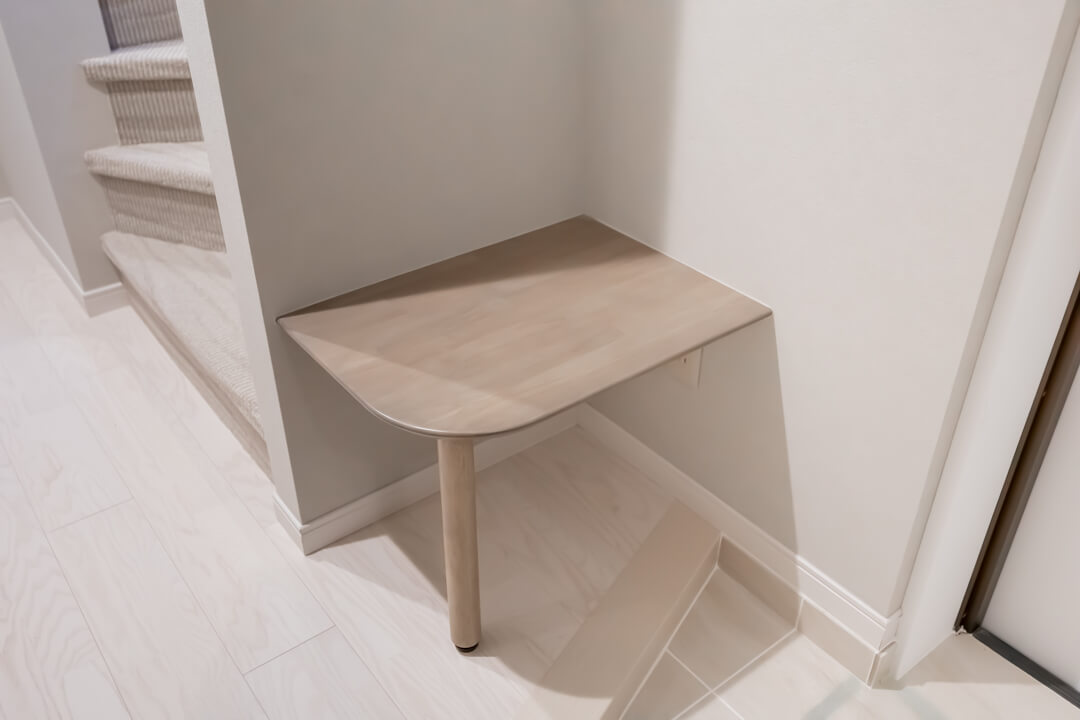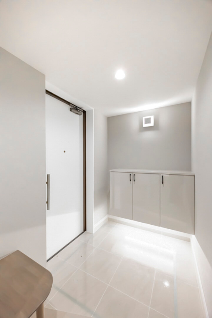 グレートーンでスタイリッシュな雰囲気の玄関です。シューズボックスは腰高のため、靴が収納できるだけでなく小物を飾ることもできます。また、フロートタイプになっているので、空間に圧迫感を与えません。フットライトの光が優しく足元を照らしてくれますよ。