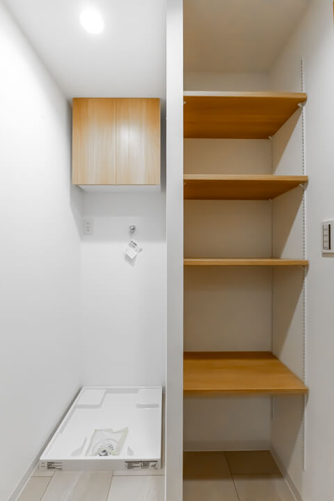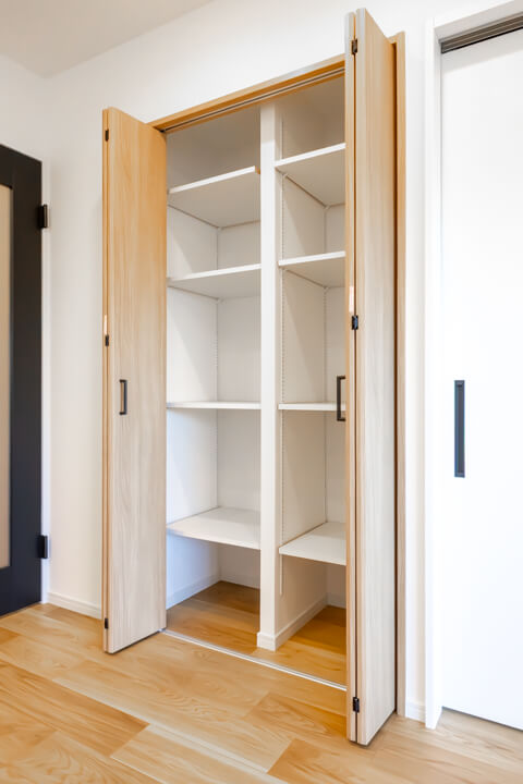 キッチン横には大容量の物入を完備。自由度の高い可動棚で、生活小物や日用品ストック、掃除機など高さのある荷物も収納できます。整理整頓してすっきりとした居住空間を実現できそうです。