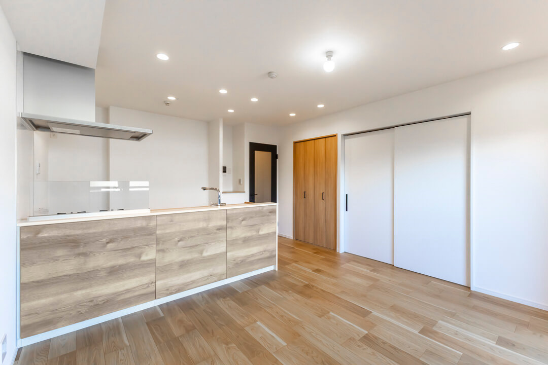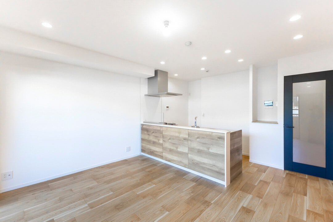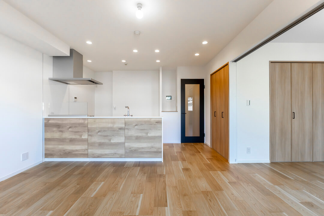 東向きの大きな窓から自然光が差し込むリビングダイニング。朝日を浴び、午前中から気持ちよく過ごせますね。室内は木目を基調とした内装で、温もりのある落ち着いた雰囲気。さまざまなテイストの家具と相性が良さそうです。キッチンと合わせて約12.0帖の空間です。